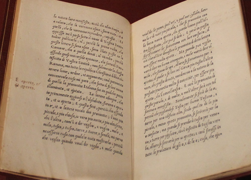 En 1524, Arrighi fonde une imprimerie qui publie des textes d’auteurs contemporains avec ses propres caractères. Dans cet ouvrage Gian Giorgio Trissino, poète et philologue, développe avec Arrighi ses théories sur la prononciation de la langue italienne, et « invente » librement de nouveaux signes, comme l’« ω », ou un étrange « s » utilisé pour rendre le son « ch ».