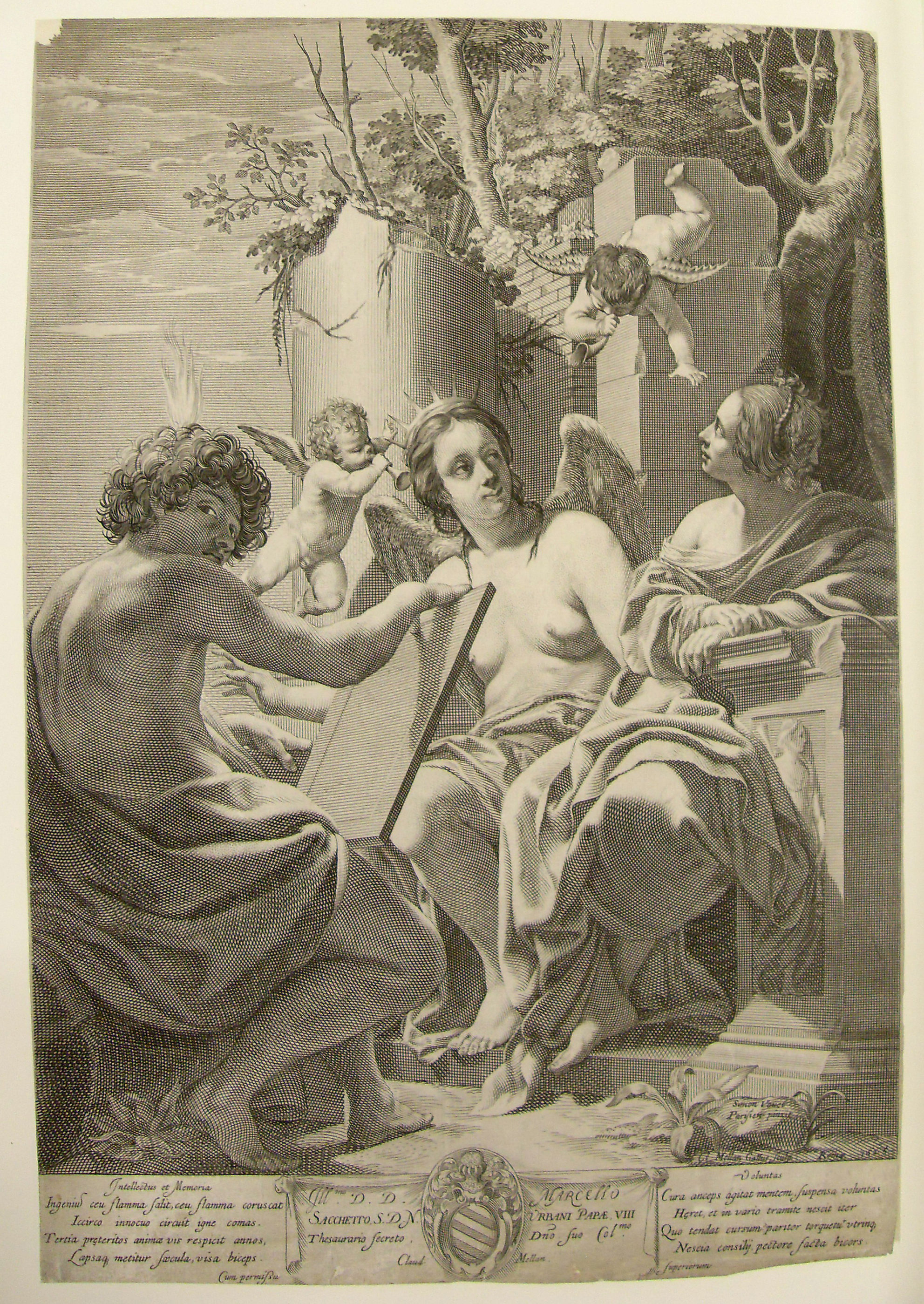 Gravure au burin d’après le tableau de Simon Vouet, conservé à la Pinacothèque du Capitole, à Rome. Trois figures allégoriques sont assises dans un décor de ruines antiques. À gauche, l’Intellect, un jeune homme aux cheveux bouclés, une flamme sur la tête. Au centre, la Volonté, ailée et couronnée, deux génies lui soufflant aux oreilles : l’un bienfaisant, l’autre non. À droite, la Mémoire, dont la tête a deux visages, une jeune femme par devant, un vieillard par derrière. Cette gravure est une commande de l’artiste lui-même, passée à son élève talentueux.