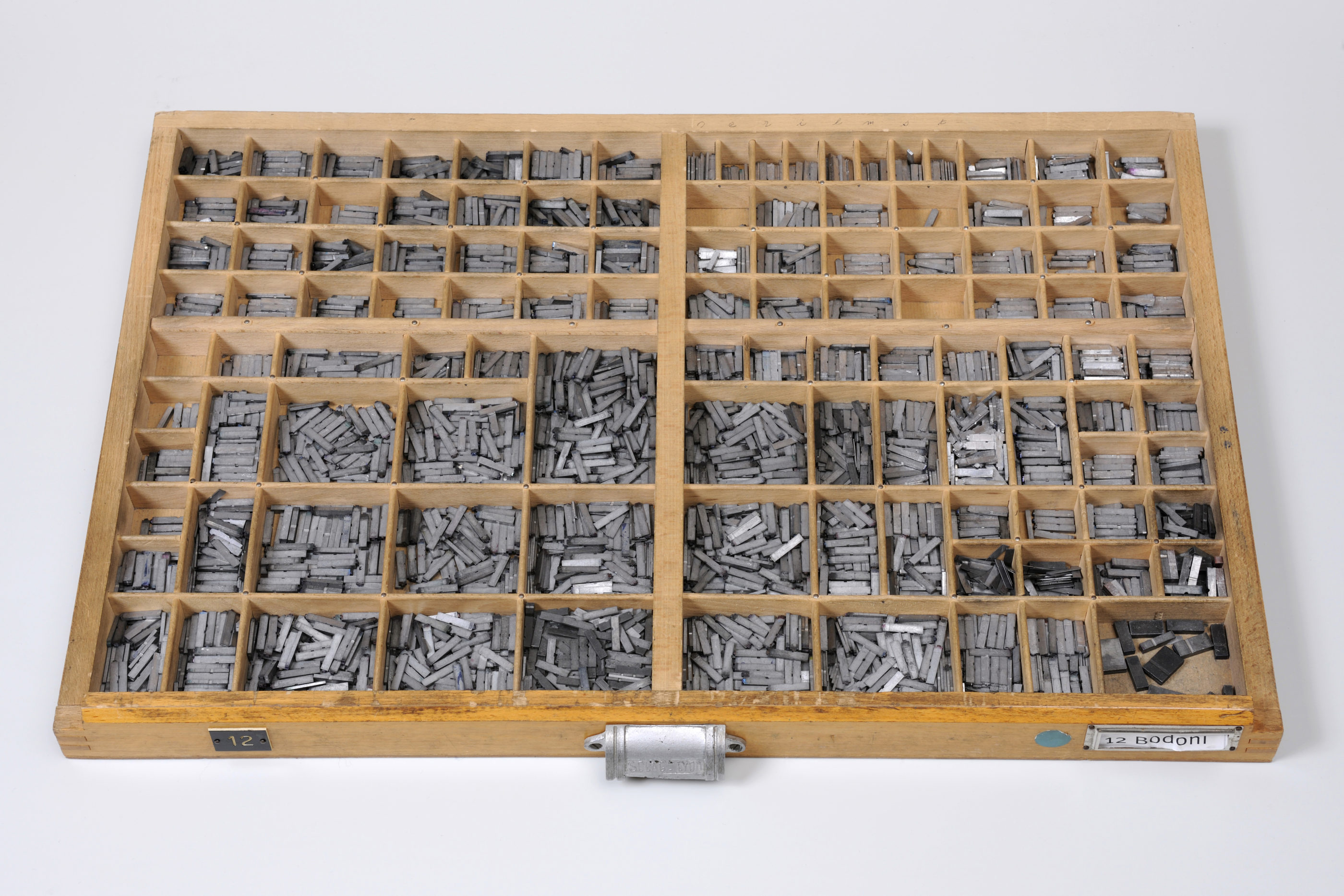 Une casse est une boîte divisée en cassetins, qui sert à ranger les caractères et signes typographiques d’un même corps et d’un même style nécessaires à la composition. Différentes tailles et dispositions de casse ont existé. Celle en exposition est une casse double qui date de l’Ancien Régime. En général, les hauts de casse (les capitales) et les signes peu utilisés sont rangés dans la boîte supérieure et les « bas de casse » (les minuscules) en bas, donc plus facilement accessibles. Ici, elle contient une copie moderne de la fonte de caractères gothiques en plomb utilisée par Gutenberg pour imprimer sa célèbre Bible. La série a été regravée et fondue par deux artisans hors pair Theo Rehak et Alan C. Waring de la Dale Guild Type Foundry, après une étude approfondie de nombreux exemplaires de la Bible de Gutenberg. Cette fonte a servi à recomposer le feuillet de la B42 que possède le Musée de l’Imprimerie. L’original et la page composée sont exposés dans cette salle.