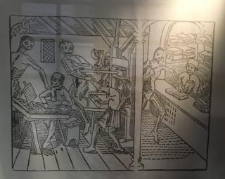 L’exposition consacrée aux danses macabres dans les livres imprimés du XVe au XXe siècle (28 février-29 mai 2004) évoquera les multiples représentations des peurs de l’homme devant la mort à travers tout un choix d’éditions des débuts de l’imprimerie à nos jours ; elle mettra également l’accent sur les évolutions parallèles des iconographies et des techniques graphiques. Outre l’intérêt du thème et des documents qui l’illustreront, cette exposition donnera à voir un ouvrage emblématique pour le Musée : La danse macabre, Lyon, Mathieu Husz, 1499, prêté par la British Library, Londres. C’est en effet la représentation de « la mort visitant un atelier d’imprimeur » que le fondateur du Musée, Maurice Audin, a utilisée pour reconstituer la presse typographique des débuts de l’imprimerie.