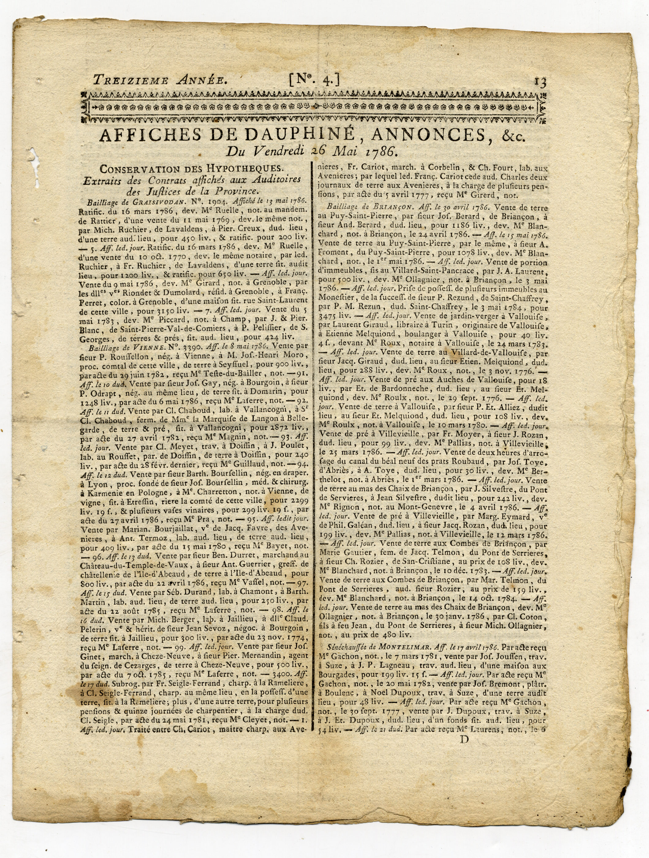 Le voisinage d’information et d’annonces publicitaires ne date, dans la presse, que de 1745, et vient d’Allemagne. En France, ce sont les Affiches de Paris, avis divers, etc., qui lancent cette formule. Par un jeu de privilèges, la formule gagne rapidement les provinces. On n’y parle évidemment pas de politique, mais d’informations commerciales, de renseignements pratiques, d’annonces de ventes immobilières, de charades et d’énigmes. Cet exemple grenoblois donne les résultats de la loterie royale : une véritable manne pour un État en manque d’argent.
