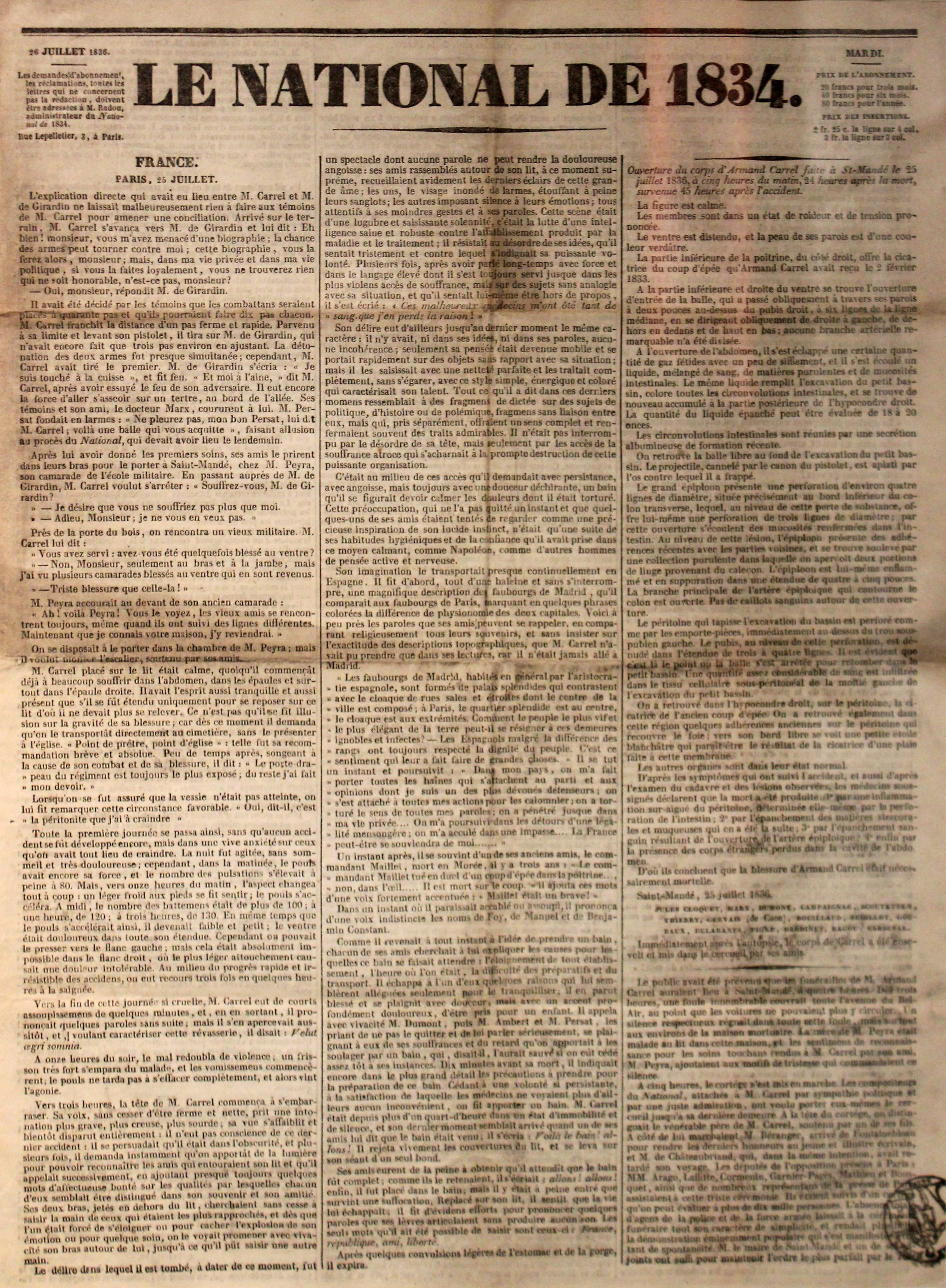 Le National est le premier journal imprimé sur des presses à vapeur de construction française. Il a été fondé par Adolphe Thiers – futur Président de la République qui jouera un rôle important dans la répression de la Commune – et le journaliste Armand Carrel. À partir de 1831, ce dernier dirige seul le journal qui est vivement concurrencé par La Presse d’Émile de Girardin. La lutte entre les deux hommes va bien au-delà de conflits commerciaux : le 21 juillet 1836, Carrel provoque en duel Girardin qui l’avait menacé de dévoiler sa liaison avec une femme mariée. À l’issue du combat, les deux hommes sont blessés. Carrel ne survit pas. Dans son numéro du 26 juillet, Le National revient sur les événements.
