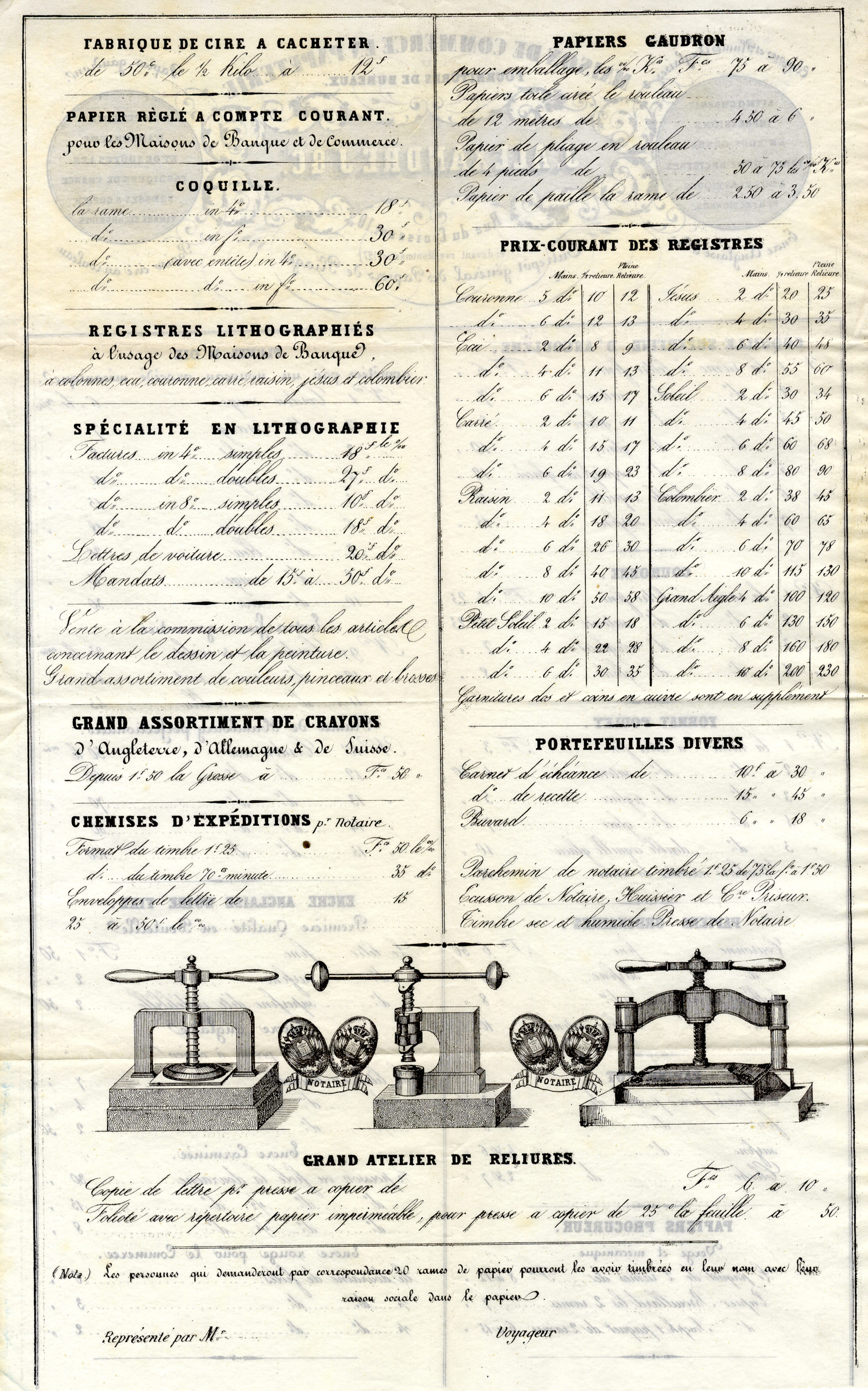 Cette facture est entièrement lithographiée. Le texte imite, pour une part, l’écriture manuscrite, pour le reste les « égyptiennes » grasses de la typographie. Les images sont quant à elles dessinées dans le style typique des gravures sur bois de bout, avec leurs hachures caractéristiques.