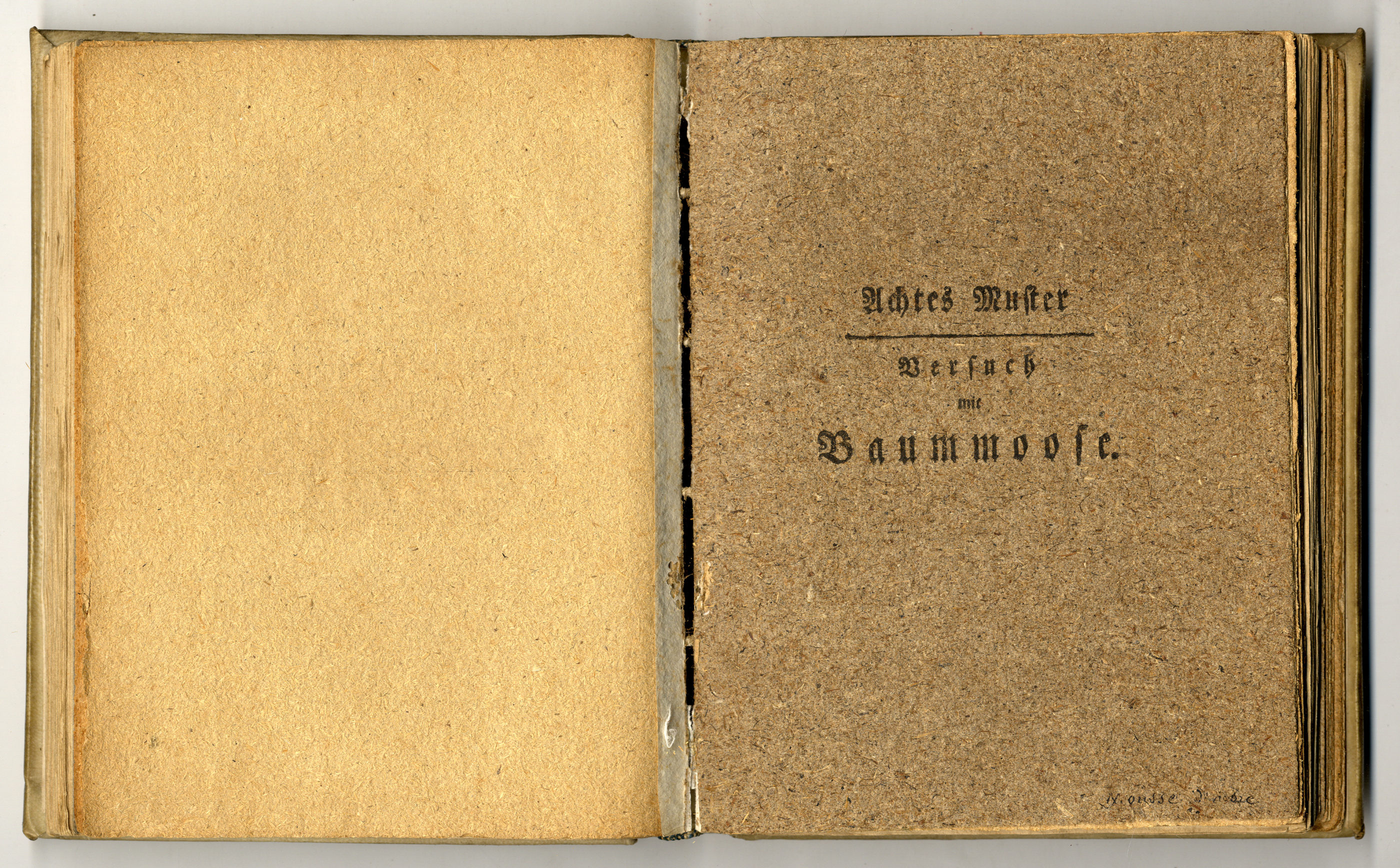 Les papiers de ce spécimen d’échantillons ont été fabriqués avec diverses matières végétales, mêlées à des chiffons. Ces recherches, peu fructueuses, visaient à palier la pénurie chronique de papier, à une époque où la demande en imprimés augmente sensiblement. Plus de 80 matières végétales sont testées, parmi lesquelles ont trouve houblon, vigne, mousse, chardon, maïs, orties, paille, tourbe, chanvre, pomme de terre, pomme de pin, saule, peuplier,…
