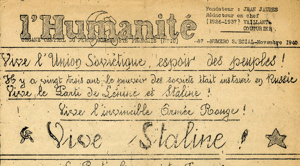 L’Humanité, organe du parti communiste français, est interdit de publication le 27 août 1939, avant même la défaite française car, fidèle à la ligne du parti, il avait donné son approbation au pacte germano-soviétique. Malgré de nombreuses négociations, il reste interdit sous l’Occupation, mais sort toujours, clandestinement. Son format est réduit. Il est composé à la machine à écrire, reproduit avec un système à stencils, et n’est distribué que localement, par des gens sûrs. Ce numéro de novembre 1940 ne s’attaque pas aux Allemands, ni à la guerre elle-même. Il déplore le sort des prisonniers politiques, mais se consacre surtout à vanter les splendeurs du paradis soviétique.