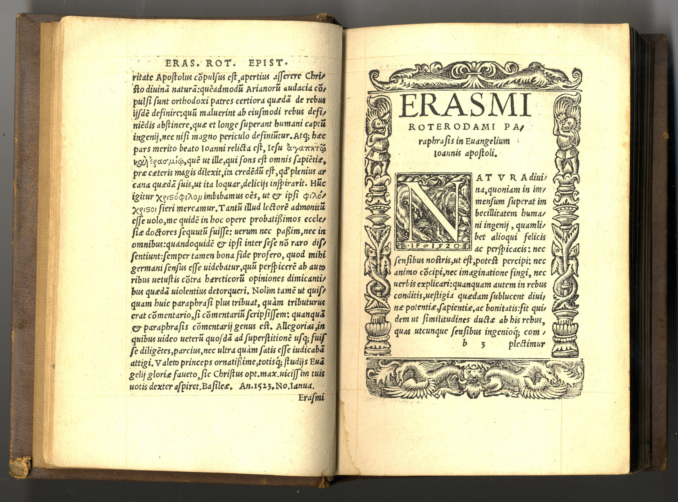 Ces Paraphrases sur l’Évangile selon Jean sont entièrement composées dans un bel italique, très peu penché, avec des capitales droites.