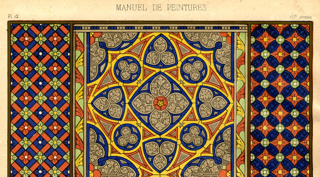 L’impression en couleurs nécessite une grande précision dans le positionnement des tirages successifs, ou repérage. Ici une impression lithographique réalisée par juxtaposition et superposition de sept couleurs en aplats (rouge, bleu, jaune, vert, bistre, gris, noir). On peut remarquer également un saupoudrage en bronze. La chromolithographie était particulièrement adaptée à l’impression de ce type de document : un album de modèles de décoration et d’ornementation pour monuments, magasins, appartements, etc.