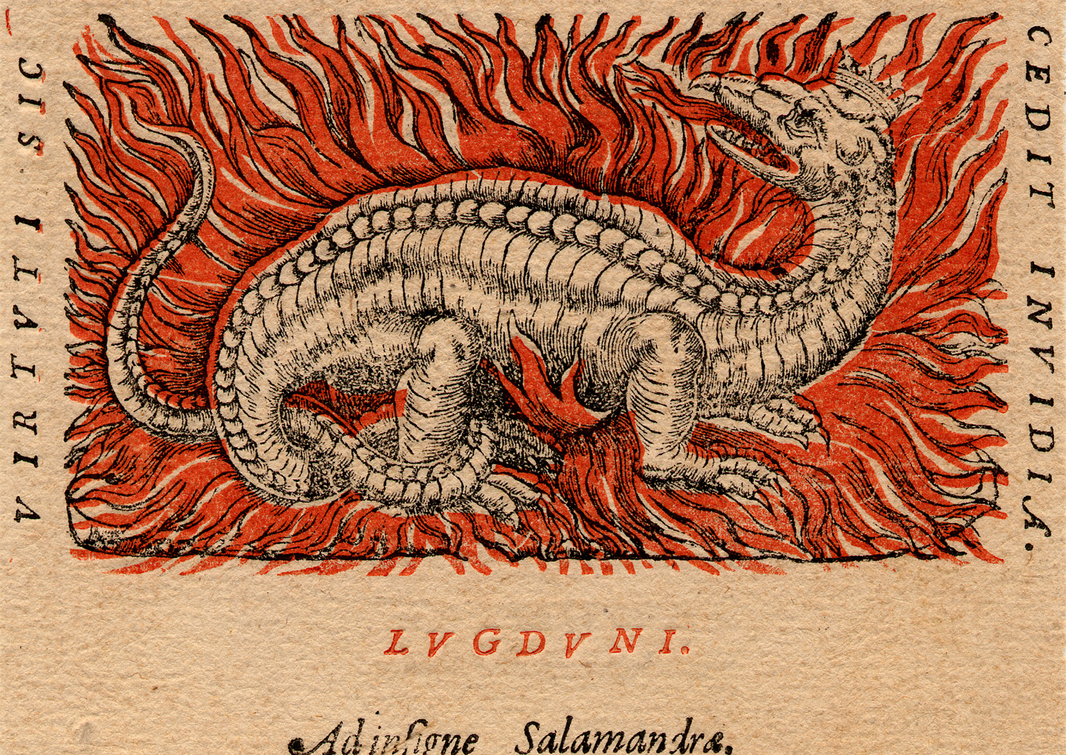 La salamandre est un symbole fréquemment utilisé dans les marques typographiques. Elle est souvent représentée sur un lit de flammes. Cela vient de la vertu magique qu’on a longtemps prêtée à cet animal d’éteindre le feu.