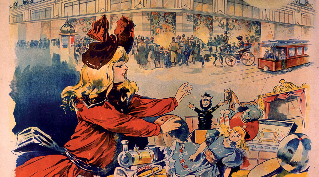 Le XIXe siècle voit l’apparition des grands magasins, dont l’entrée est libre, et qui pratiquent des prix fixes et affichés (mettant fin au marchandage). Ce nouveau moyen de distribution accompagne l’émergence des classes bourgeoises. Pour promouvoir ces nouveaux lieux, l’affiche est mise à contribution. Sur cette affiche publiée lors de l’Exposition internationale de 1894, on peut voir le Grand Bazar de Lyon, qui se trouvait place des Cordeliers à deux pas du Musée de l’imprimerie et de la communication graphique, à l’emplacement de l’actuel magasin Monoprix.