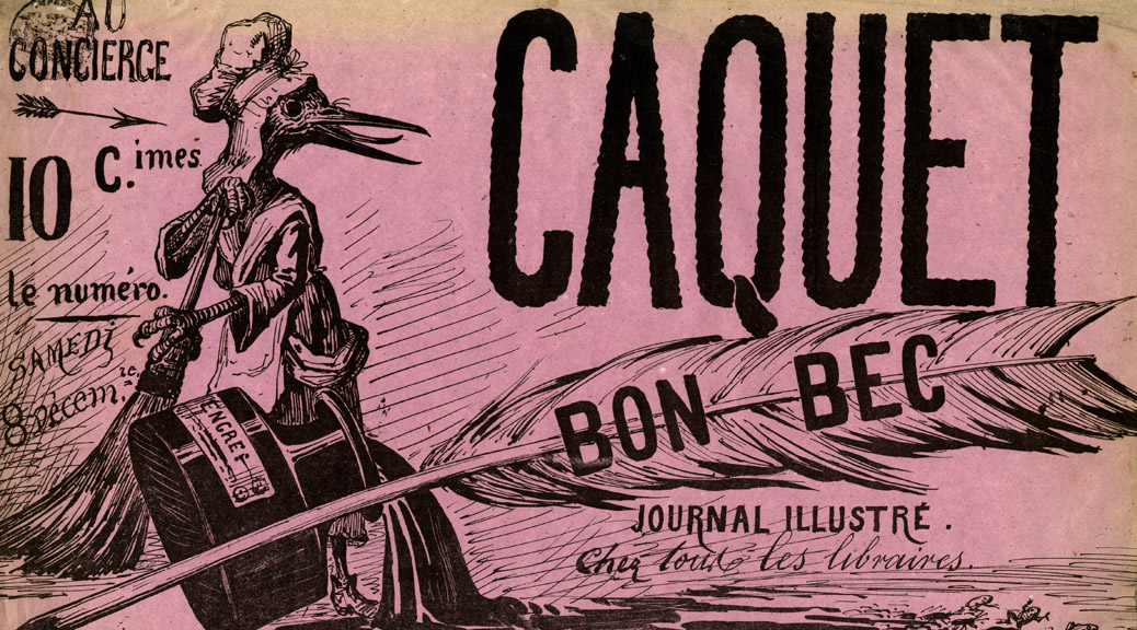 Affiche publicitaire pour un journal comique hebdomadaire lyonnais (1866–1867), créé suite à l’interdiction du Journal de Guignol par la censure impériale de Napoléon III. Le nom du caricaturiste, Barbari, est un pseudonyme. Tout comme ceux de Titi, Toto, Carabi et Carabo, tous collaborateurs du journal.