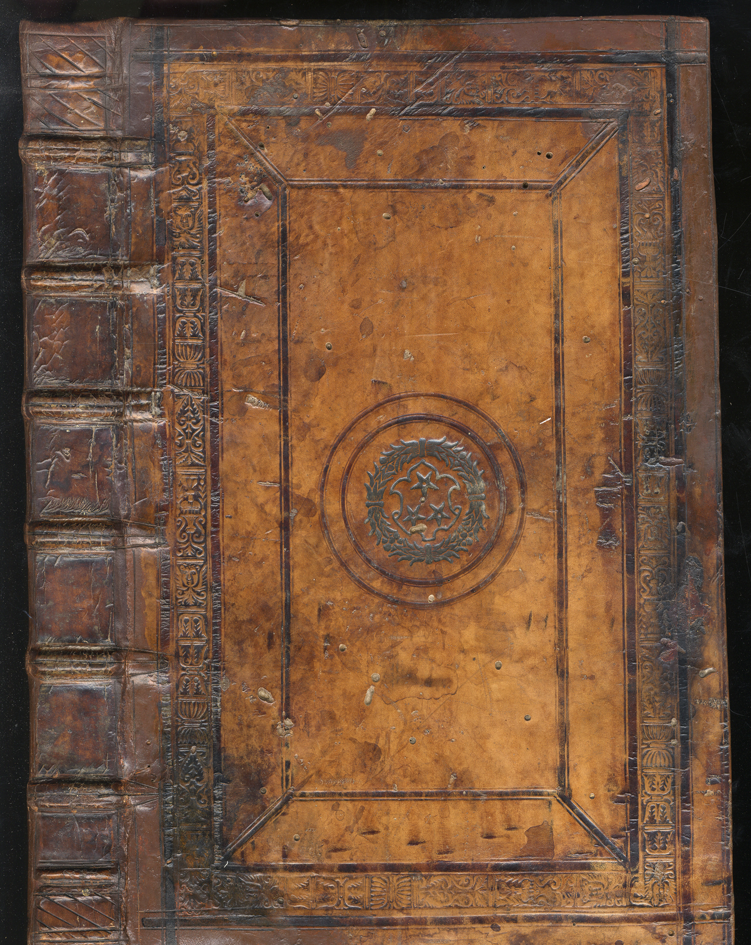 Les plats portent ses armes « d’azur à trois molettes d’or ». Le Court a fait relier, en tête de ce volume, deux fragments de deux autres incunables relatant la vie de l’empereur Hadrien.