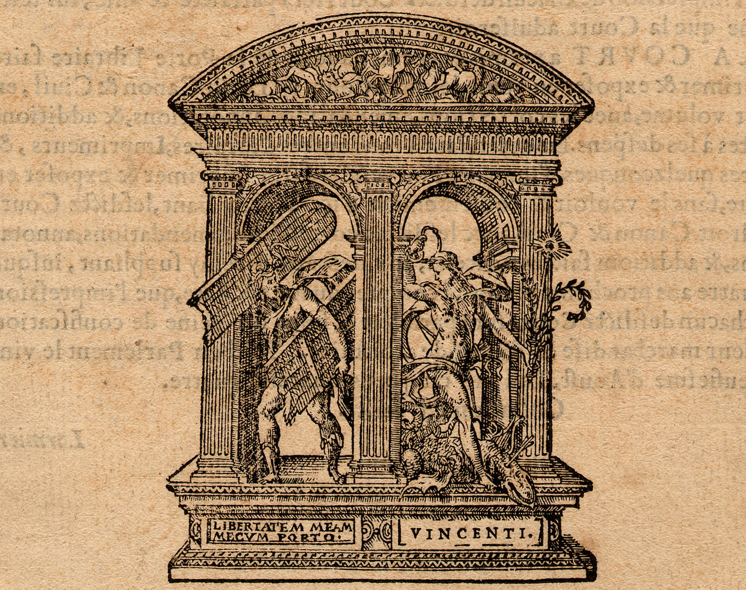 Marque typographique des libraires associés, Hugues de La Porte et Antoine Vincent. Elle représente Samson emportant les deux portes de Gaza, avec la devise Libertatem meam mecum porto (j’emporte ma liberté avec moi).