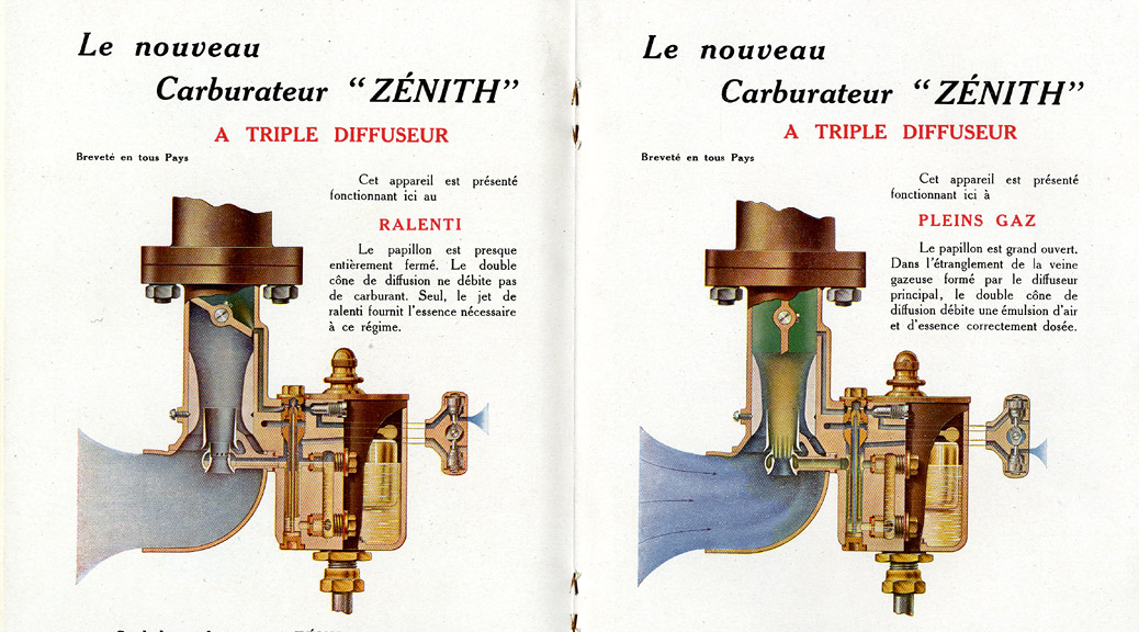 La société lyonnaise Zénith, fabricant du carburateur mis au point en 1907 par François Baverey, mène une politique commerciale très agressive. Cette plaquette, admirablement bien dessinée et imprimée en trichromie, sert à la fois à des fins techniques et publicitaires.