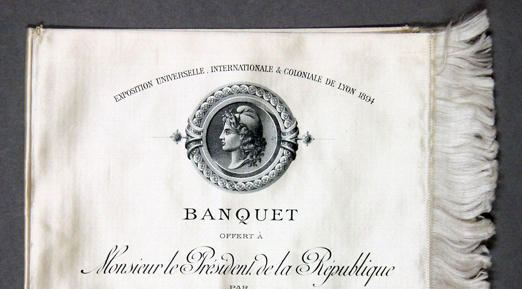 Cette impression de luxe, lithographiée sur soie, présente le menu du banquet offert à Sadi Carnot à l’occasion de l’Exposition universelle ainsi que le programme du concert donné par les élèves du Conservatoire national de musique de Lyon, le tout illustré de jolies vignettes représentant des vues de Lyon.