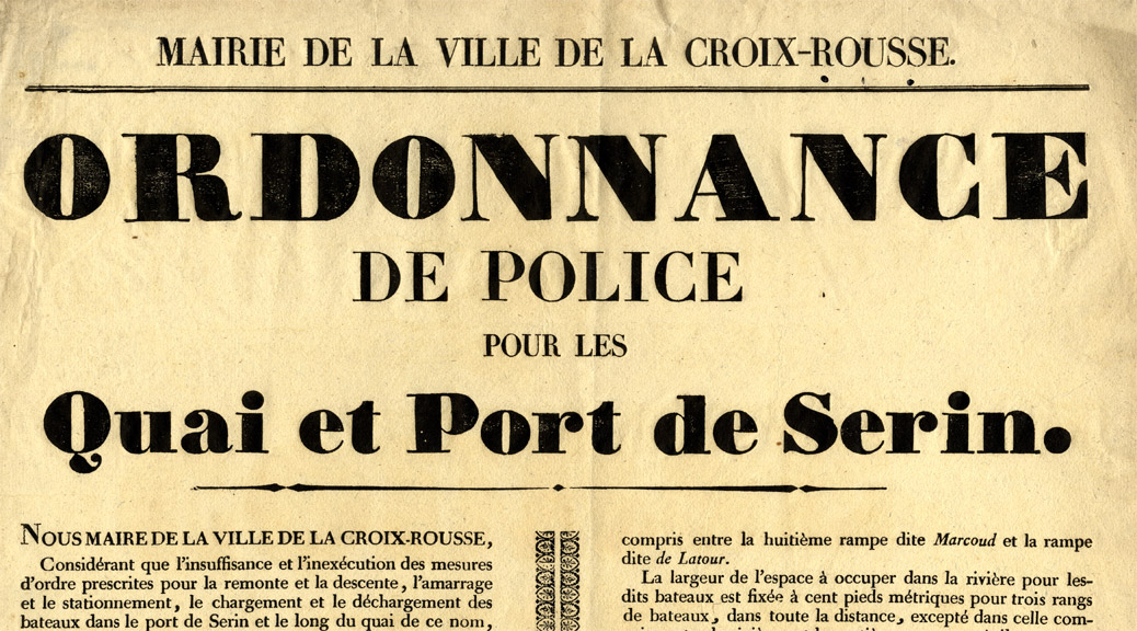 Le placard est le moyen privilégié de communication entre les administrations et leurs administrés. La mise en page classique des affiches de l’Ancien Régime évolue lentement au début du XIXe siècle, sous l’influence de la réclame avec ses gros caractères gras conçus pour attirer l’œil du passant. Ici, il est question de la régulation de la circulation des bateaux dans le port fluvial de Serin près de Lyon et le partage des quais de la Saône avec les passants.