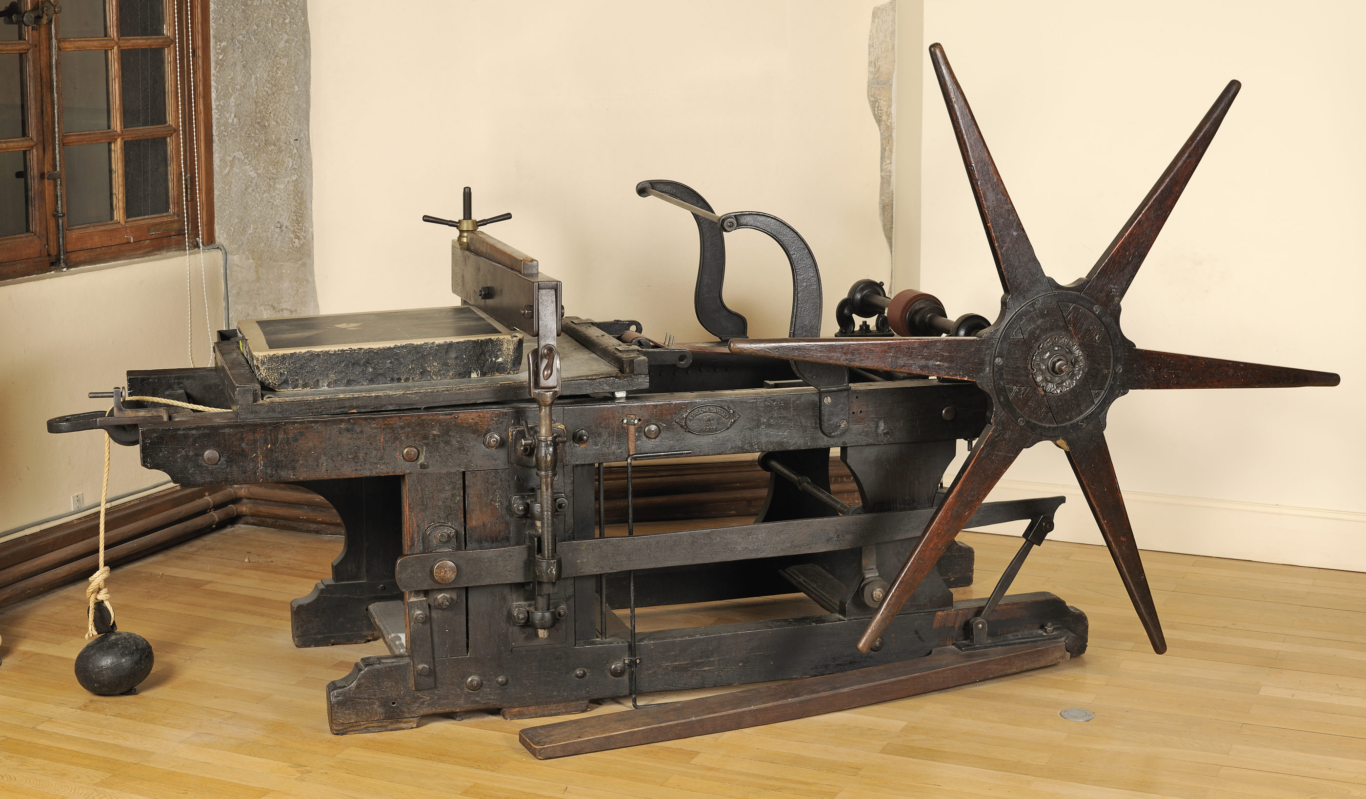 Pour imprimer une lithographie, le pressier pose la pierre sur le lit d’une presse appelée familièrement « bête à cornes ». La pierre est ensuite humidifiée et, le calcaire étant poreux, l’eau est retenue par les zones de pierre vierge, sans image. Ếtant grasses, les parties dessinées de l’image repoussent l’eau. On passe alors un rouleau chargé d’encre grasse. Comme l’eau et le gras se repoussent, l’encre n’adhère que sur les parties dessinées. Le lithographe dispose alors une feuille de papier sur la pierre, puis un carton rigide, avant de passer le tout sous une lame, la « racle », qui décalque l’image sur le papier. L’impression est réalisée.