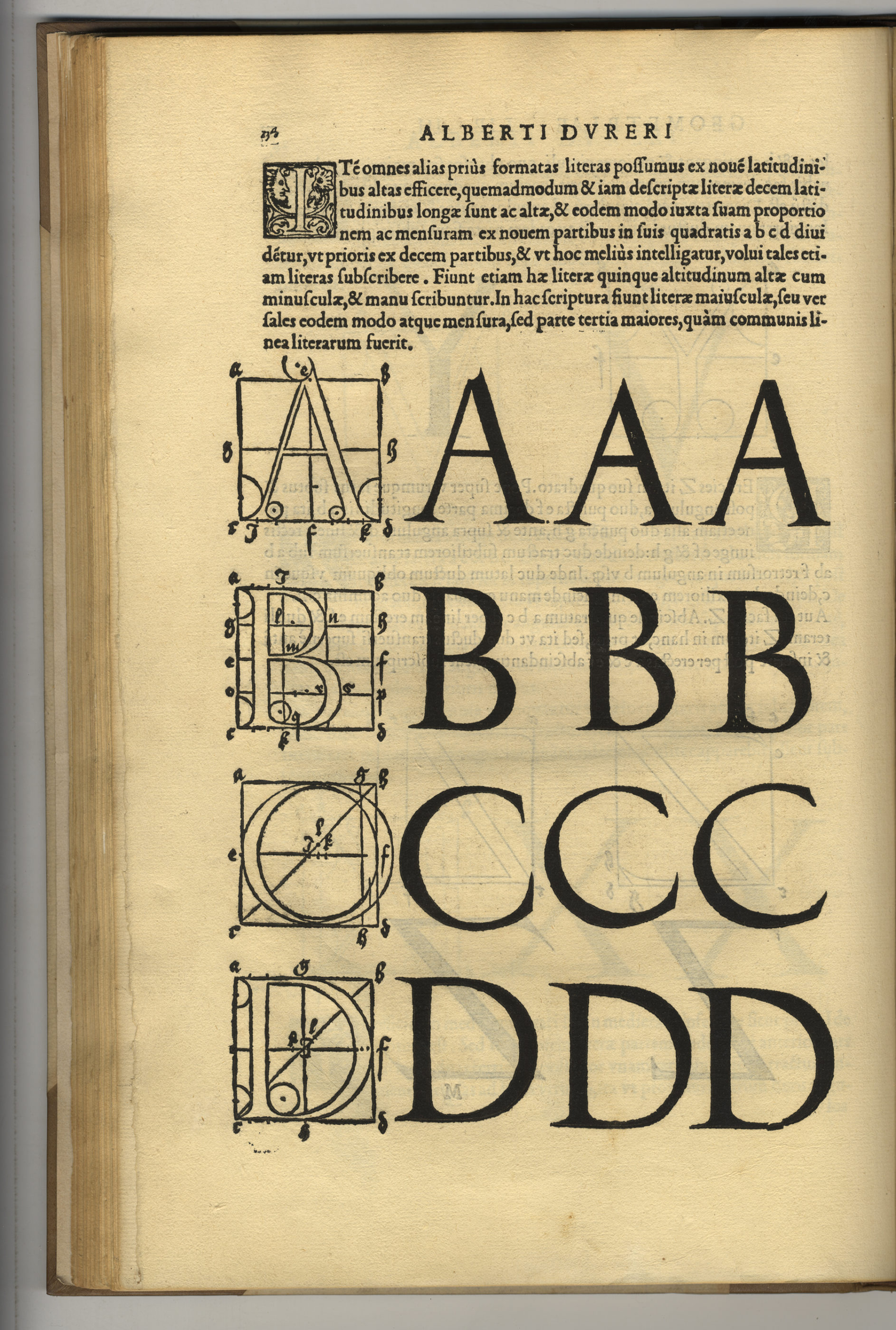 Au XVIe siècle, la recherche d’harmonie passe par la géométrie et le calcul, qu’il s’agisse de peinture, de sculpture ou de typographie. Une partie de ce livre du peintre, graveur et mathématicien allemand Albrecht Dürer – édité par le grand imprimeur-libraire parisien Christian Wechel – traite de la construction des lettres.