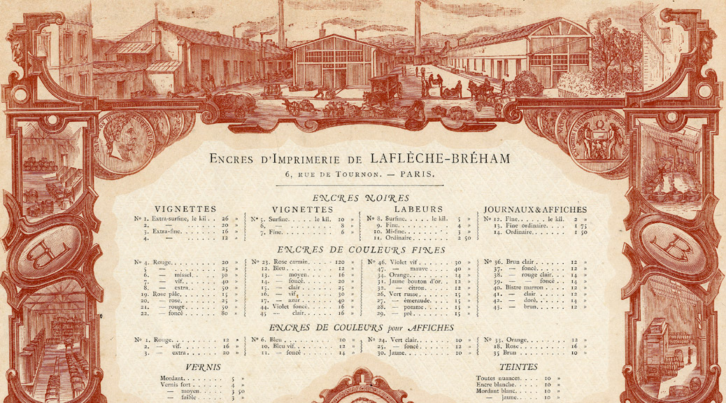 Jusqu’à la fin du XVIIIe siècle, la plupart des imprimeurs fabriquent eux-mêmes leur encre. Mais avec l’industrialisation de l’imprimerie, de moins en moins d’entreprises sont en mesure de maîtriser toute la chaîne de production. La fabrication d’encres devient alors un métier à part entière, dont les techniques suivront de près les progrès de la chimie industrielle. Les fabricants se battent sur ce nouveau marché à grand renfort de livres spécimens, d’affiches et de cartes de commerce, typographiées dans le cas de Daumas, ou ornées de gravure sur bois de bout pour Laflèche-Bréham.