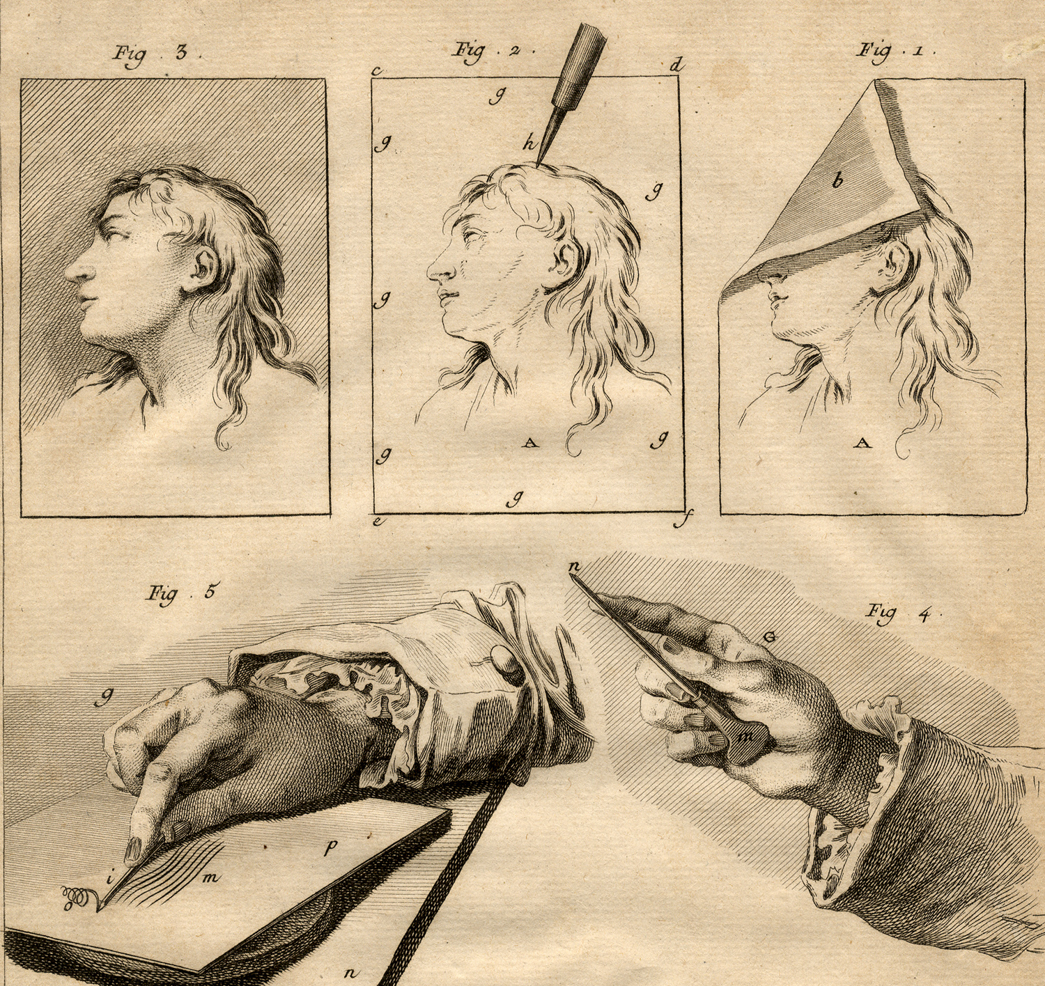 Ces deux planches, bien que datant du XVIIIe siècle, donnent un aperçu très précis d’un métier qui n’avait guère évolué depuis le temps des premiers imprimeurs. Elles montrent un atelier de gravure, les différents outils utilisés par le graveur ainsi que les principes de gravure, c’est-à-dire les diverses façons de tailler ou de creuser le bois en fonction de l’effet désiré.