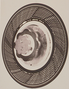 un disque en verre maintenu en rotation constante. Un éclair ultra-rapide vient traverser les lettres pour les projeter sur un film photographique. Le film qui en résulte sert à l’insolation d’une plaque imprimante, montée ensuite sur une presse offset pour le tirage. Ce disque provient de l’atelier de composition de la société Deberny & Peignot, Paris.