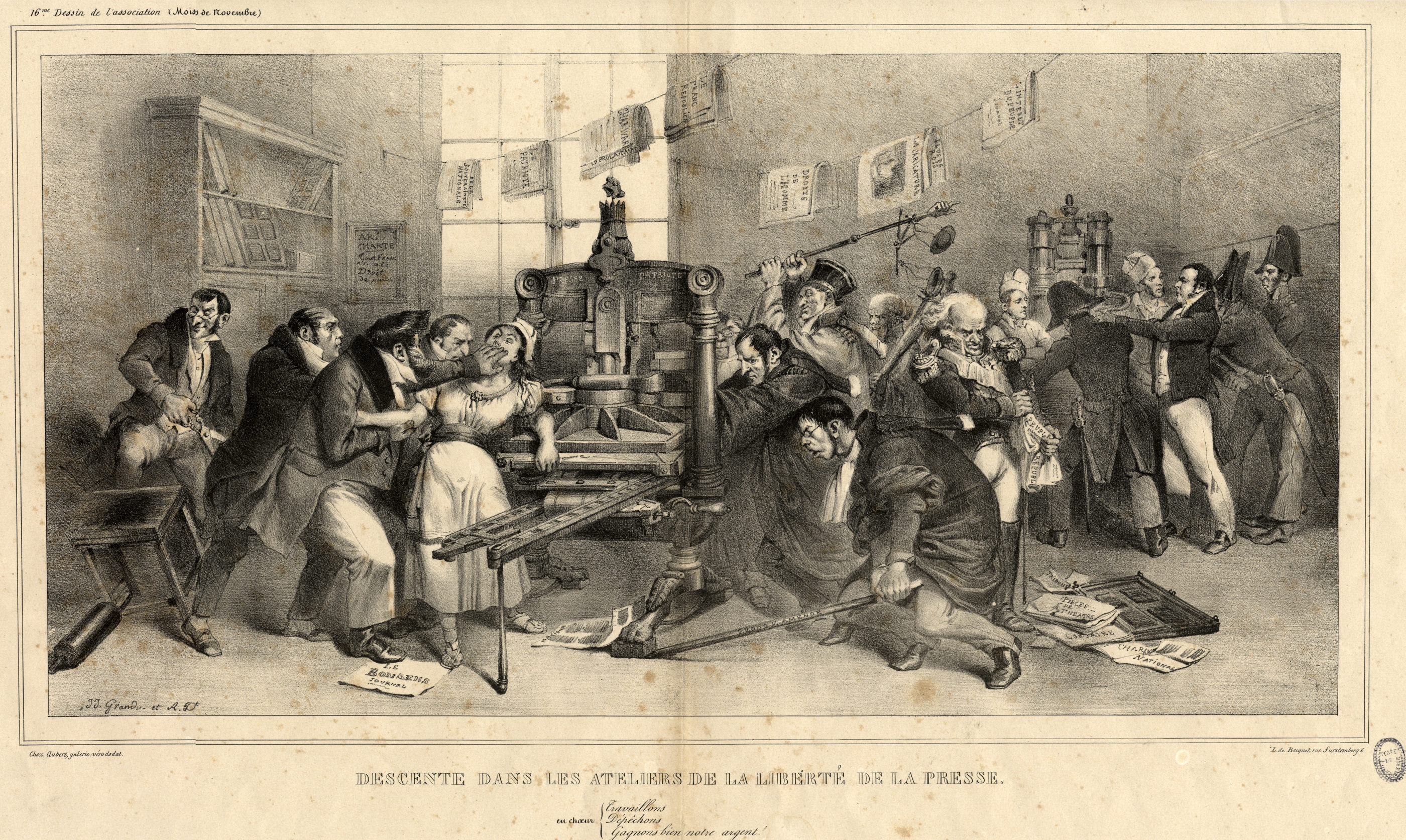La liberté de la presse est un enjeu politique majeur pendant une grande partie du XIXe siècle, et ne sera définitivement acquise qu’en 1881. De nombreux hommes politiques (surtout libéraux) contribuent régulièrement aux journaux. De même, les typographes participe activement à la contestation sociale en raison de leur statut d’ouvriers qualifiés, lettrés et fortement syndiqués. Mais, de manière générale, le pouvoir se méfie de l’influence que la presse exerce sur l’opinion publique. Non sans raison : la suspension de la liberté de la presse par ordonnances, le 25 juillet 1830, est à l’origine de la Révolution qui chasse Charles X du pouvoir.