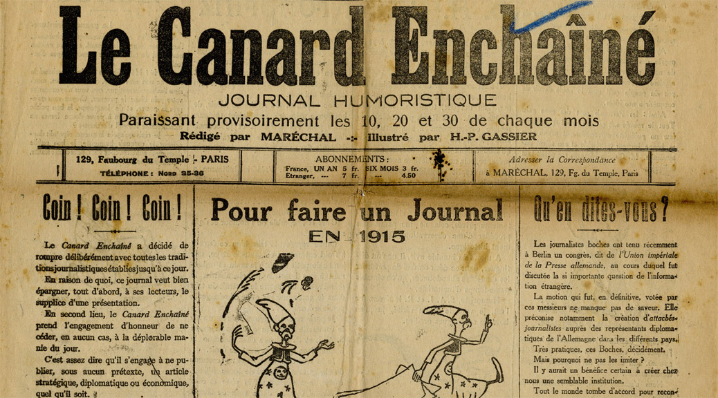 Créé en 1915, le Canard enchaîné entend s’attaquer « à la guerre, à la censure, aux politiciens, aux affairistes, aux curés, au pouvoir, à la guillotine ». Il dénonce les scandales publics, refuse toute publicité pour éviter l’influence des annonceurs sur son contenu, et choisit comme devise : « La liberté de la presse ne s’use que quand on ne s’en sert pas ». C’est au Canard et à son confrère Le Crapouillet qu’on doit l’expression « bourrage de crâne ».