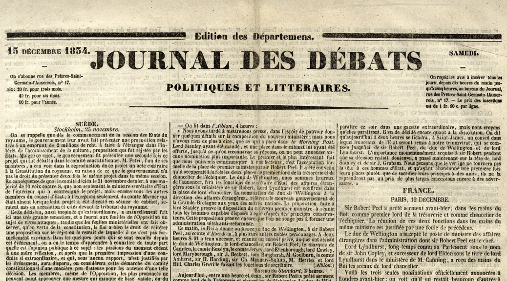 Le coût du timbre pousse les éditeurs à mettre un maximum d’informations sur la feuille, aboutissant ainsi à des mises en page très denses. Ainsi, le Journal des débats adopte un format plus grand pour optimiser l’espace disponible. Pour aider le lecteur à se retrouver dans une telle densité d’information, un nouvel outil graphique apparaît : les intertitres en caractères gras.