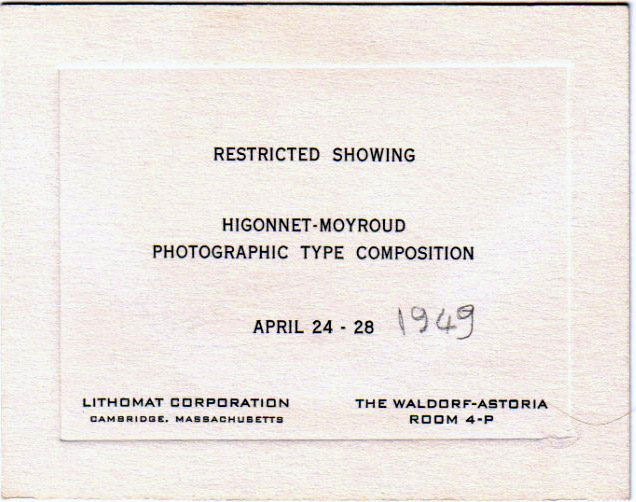Le prototype de la Lumitype-Photon est dévoilé lors du congrès annuel des entreprises de presse nord-américaines au Waldorf Hotel, à New York, en 1949. La rumeur de la naissance d’une machine à composer révolutionnaire se répand comme une traînée de poudre, et l’électrochoc qui en résulte dans les industries graphiques facilite le financement du modèle industriel de la machine.