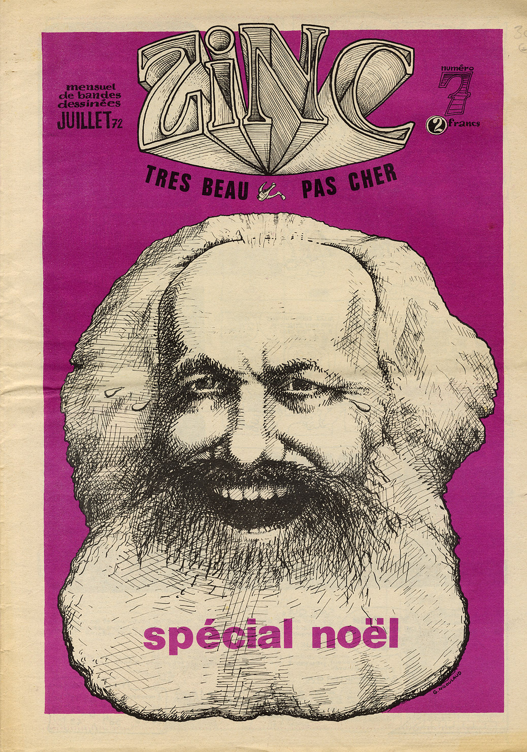 Arrivée des États-Unis dans le sillon de la Beat generation et du mouvement hippie, la bande dessinée undergound mêle recherches graphiques, critiques sociale et politique. Elle détourne les codes traditionnels des genres dominants, avec beaucoup d’humour. Ici, Karl Marx joue des faux airs de Père Noël, et la faucille soviétique est accompagnée d’une bouteille de vin, et non d’un marteau.