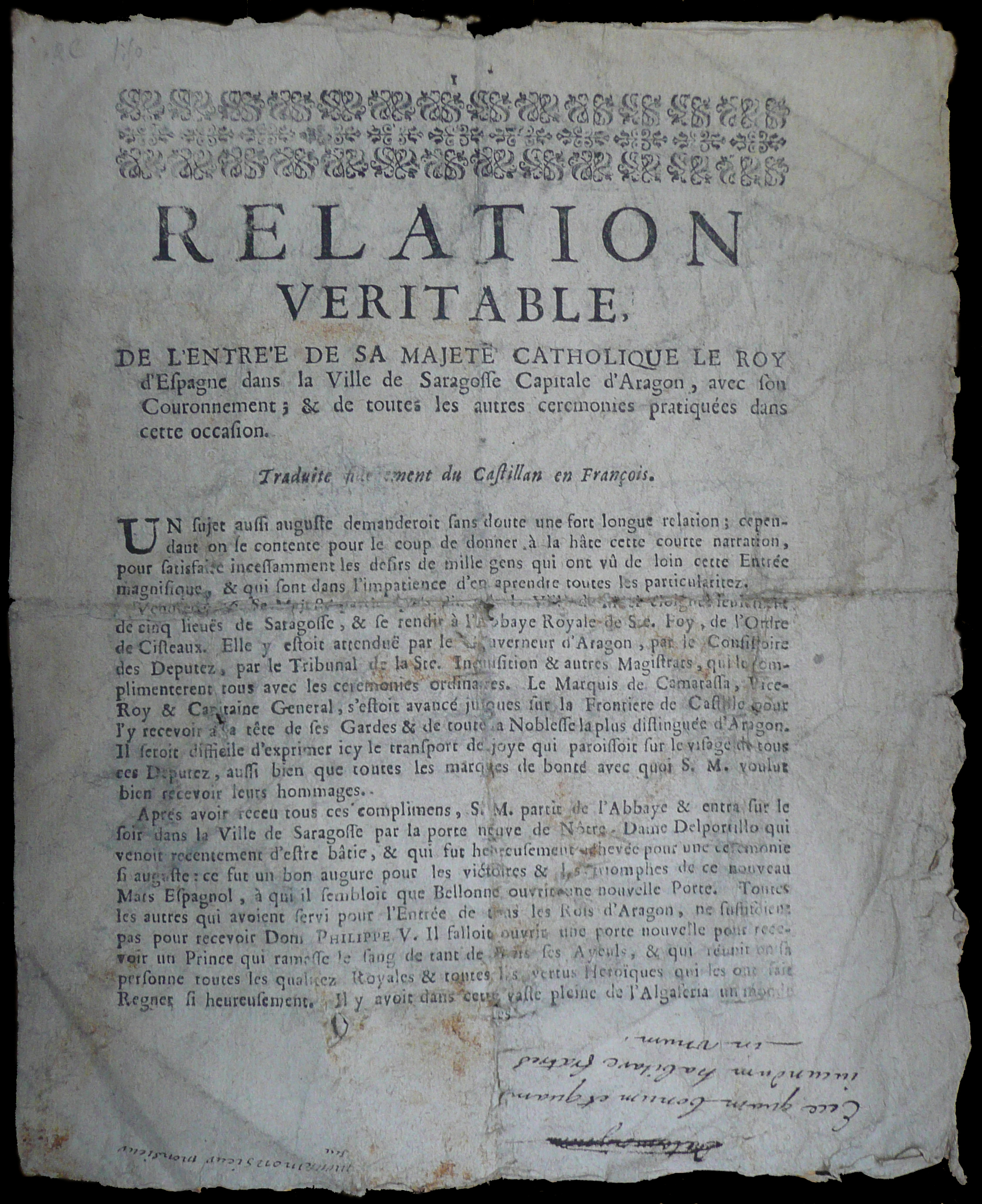 Relation véritable de Sarragosse, entrée de Sa Majesté catholique le Roy d’Espagne