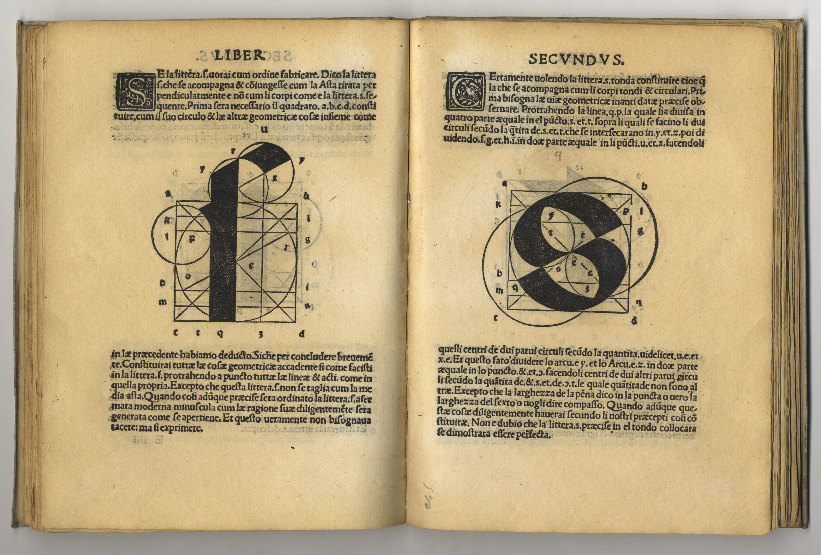 Au XVIe siècle, de nombreux savants tentent d’appliquer à l’alphabet une grille de construction géométrique, semblable à celle utilisée par l’architecte Vitruve (Ier siècle av. J.-C.) et reprise par Léonard de Vinci.