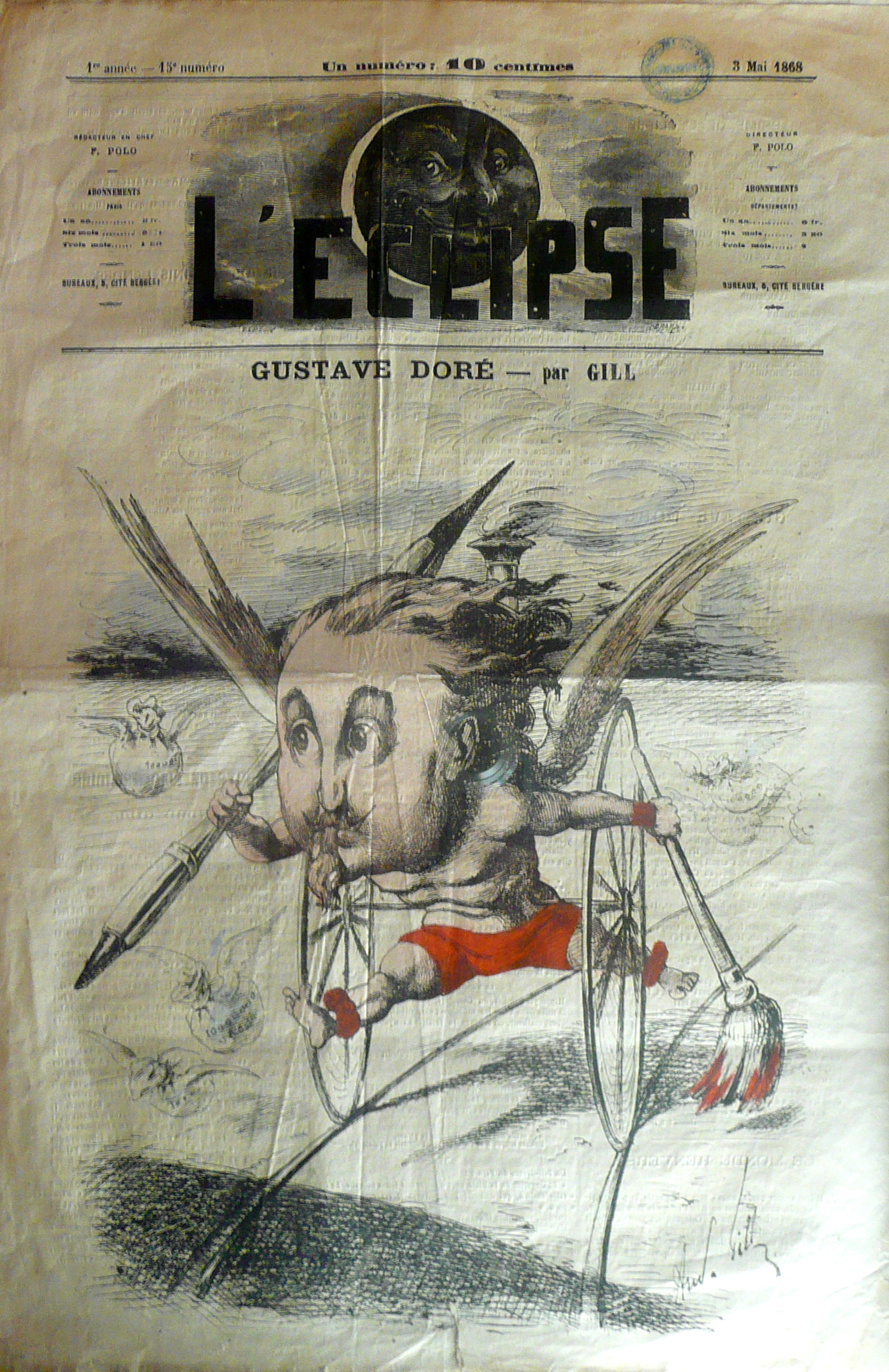 Illustrateur, peintre et chansonnier, Gill croque ici le portrait de son confrère Gustave Doré (1832–1883). Gill est admiratif du travail de Doré, mais dans cette caricature on sent une pointe d’envie face au succès commercial de l’artiste : s’appuyant sur une plume et un pinceau, un Gustave Doré ailé file à toute allure sur la voie (de chemin de fer) de la fortune, entouré de sacs d’argent volants.