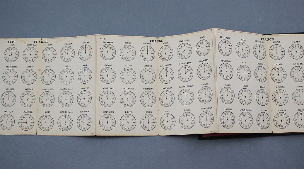 En 1869, le calcul du temps n’a pas encore acquis la précision actuelle : pour faire fonctionner leur réseau sans accidents, les chemins de fer britanniques établissent un temps unique en 1847, qui ne devient officiel qu’en 1888. Certains horlogers proposaient alors des montres avec deux aiguilles des minutes : l’une pour l’heure locale, l’autre pour l’heure nationale. Cet ouvrage permet de connaître, à partir de l’heure à Paris, l’heure exacte dans des villes non seulement à l’étranger, mais aussi en France !