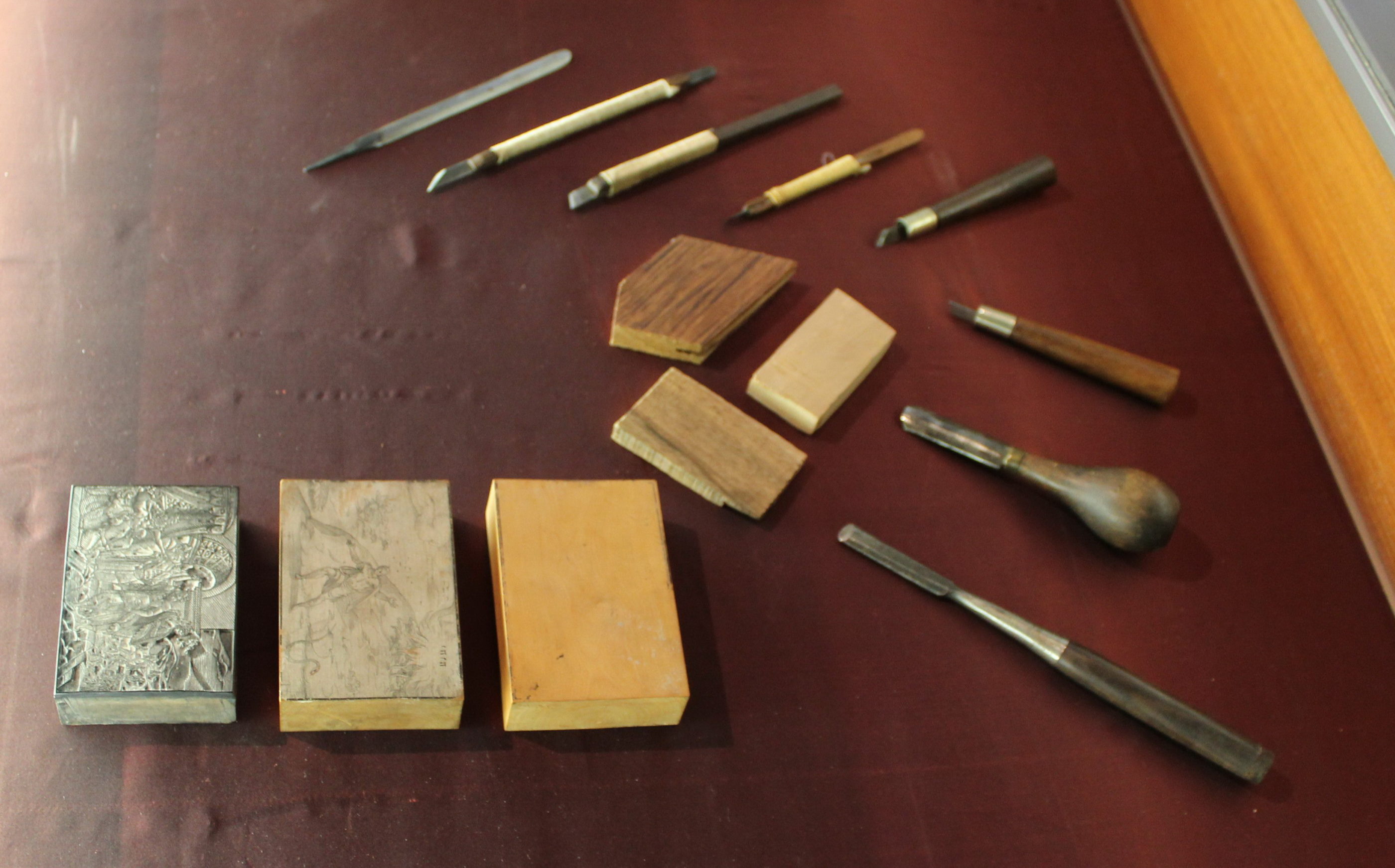 - Le bois est d’abord calibré. La surface de ce bois n’a pas encore été préparée pour recevoir le dessin de l’image. On distingue cependant les traces du cadre qui bordera l’image.