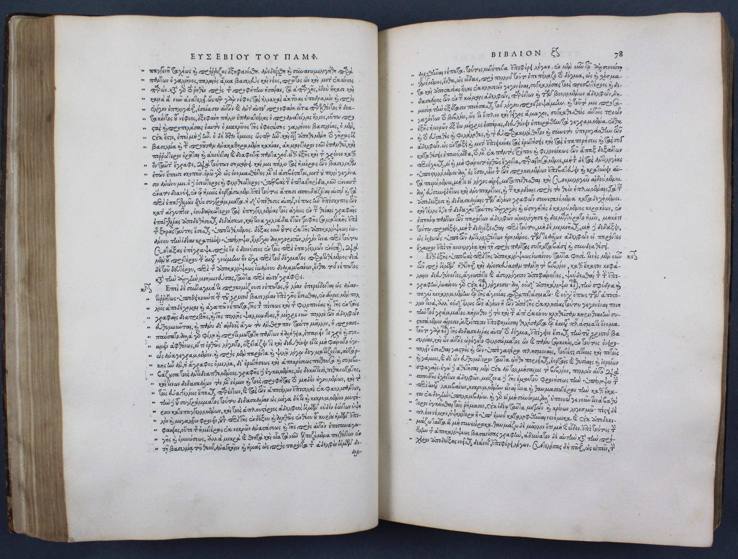 Cette Histoire ecclésiastique est le premier ouvrage imprimé par Robert Estienne (1503–1559) avec les Grecs du Roi, caractère gravé par Claude Garamont (vers 1499–1561), qui démontre ici toute sa virtuosité. Basé sur l’écriture du calligraphe crétois Ange Vergèce, ce caractère est d’une complexité et d’une beauté toute particulière : il dispose d’environ 512 ligatures (lettres liées entre elles) reproduisant les connexions (nexus) de l’écriture manuscrite.