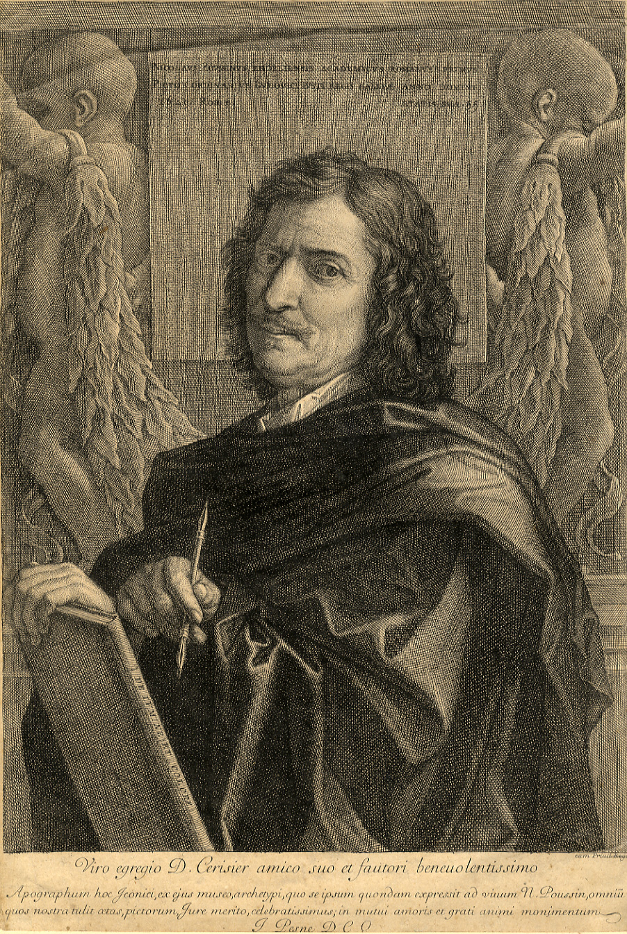 Jean Pesne a reproduit en estampe de nombreuses toiles de Poussin, y compris ses autoportraits. Ici, une gravure au burin sur cuivre. L’estampe est dédicacée à un certain Cerisier, présenté comme un « ami et bienfaiteur ». En effet, Poussin a fait don du tableau, exécuté en 1649, à deux amis marchands, Jean Pointel et Jacques Cerisier, ses futurs exécuteurs testamentaires.