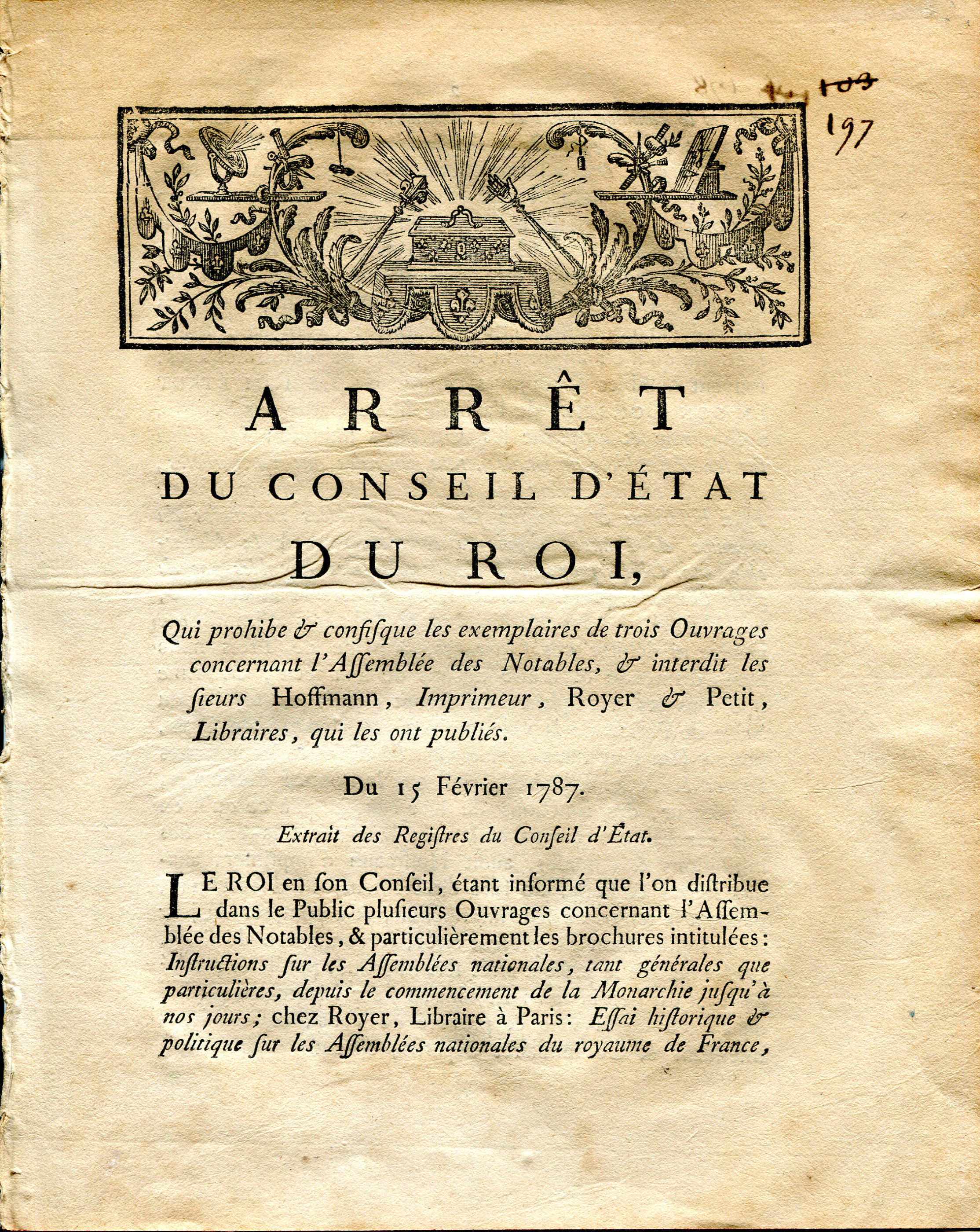 Cet arrêt interdit un ouvrage qui s’en prend aux assemblées des notables. Les gouvernants du XVIIIe siècle, rois, princes, mais aussi les élites urbaines, doivent composer avec un nouvel élément : l’opinion publique. La diffusion des idées révolutionnaires remet en cause leur légitimité. Par le texte et l’image ils tentent de redorer leur blason… et éliminent les opposants par décrets, arrêts, confiscations et amendes.