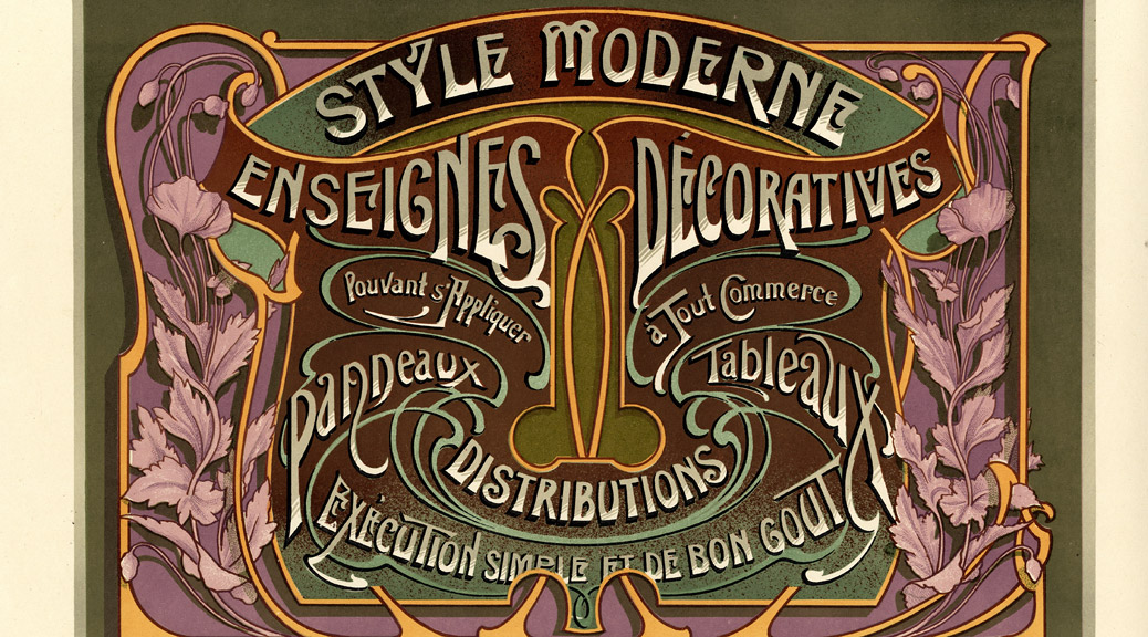 Le style Art nouveau a très fortement influencé la production graphique au tournant des XIXe et XXe siècles, avec ses aplats de couleurs, ses motifs végétaux et ses lettrages fantaisistes envahissants. Cette planche lithographiée, extraite d’un manuel pour peintres en lettres, offre un exemple très abouti de la chromolithographie maîtrisée à des fins commerciales.