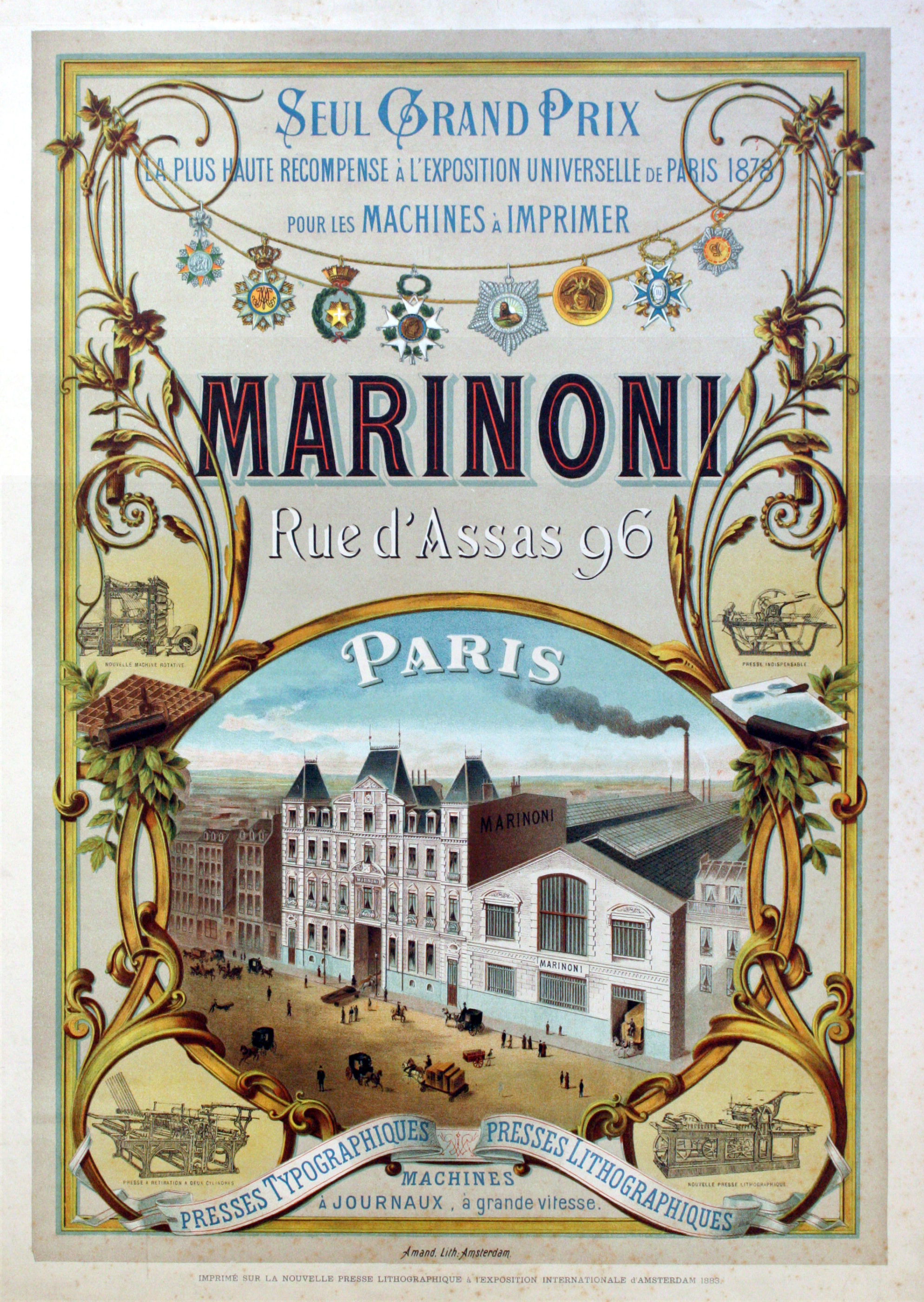 Affiche publicitaire chromolithographiée en sept couleurs par Armand, lithographe à Amsterdam. La vue des usines Marinoni est entourée de quatre presses mécaniques. Les expositions internationales permettaient aux industriels de concourir et de recevoir prix et distinctions, telles les médailles honorifiques qui s’alignent ici sur un cordon en haut de l’affiche.