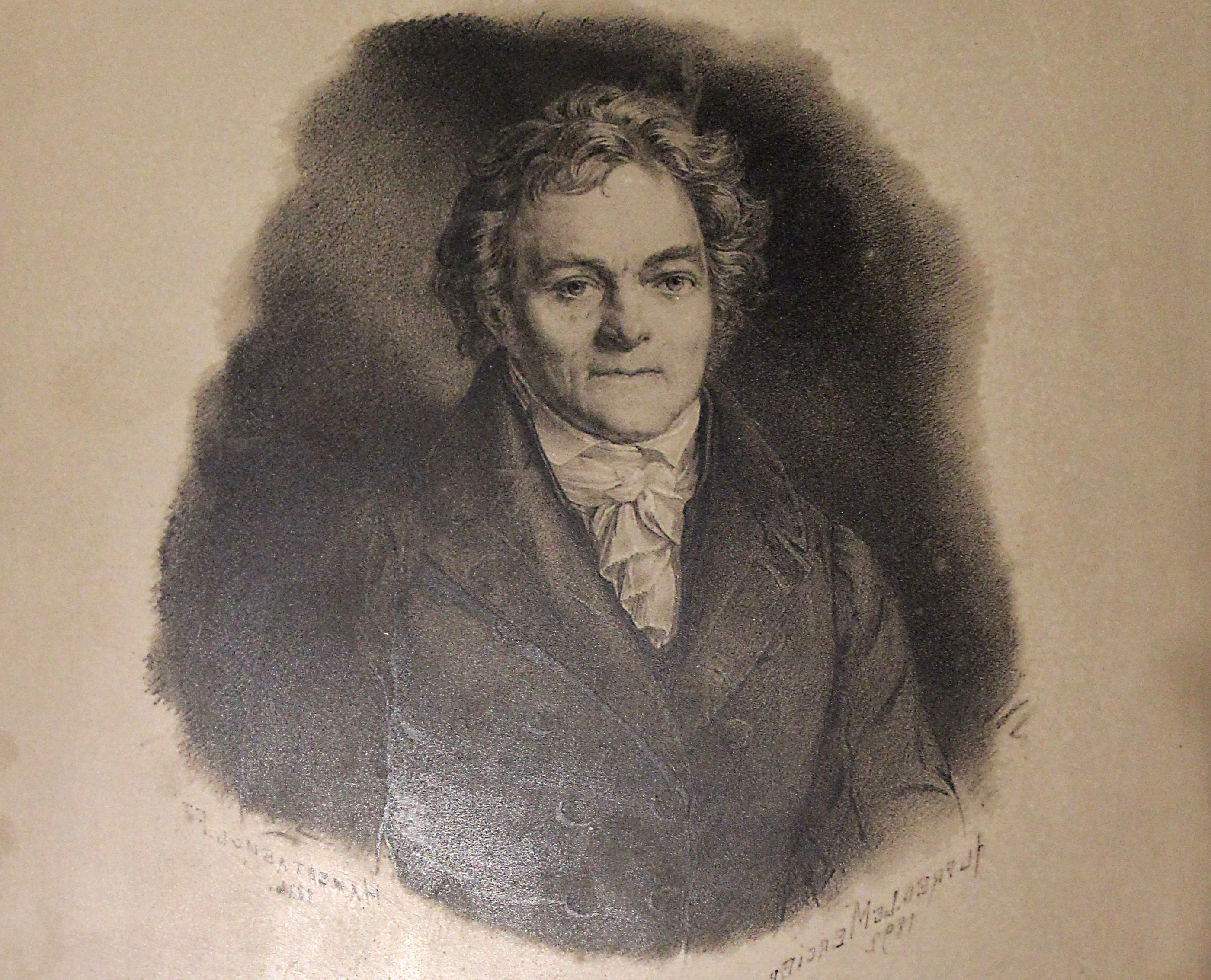 Pierre lithographique matrice d’un portrait de Aloys Senefelder (1771-1834). Elle dessinée au crayon par l’imprimeur lithographe et artiste Alfred Lemercier d’après Hanfstaengl.