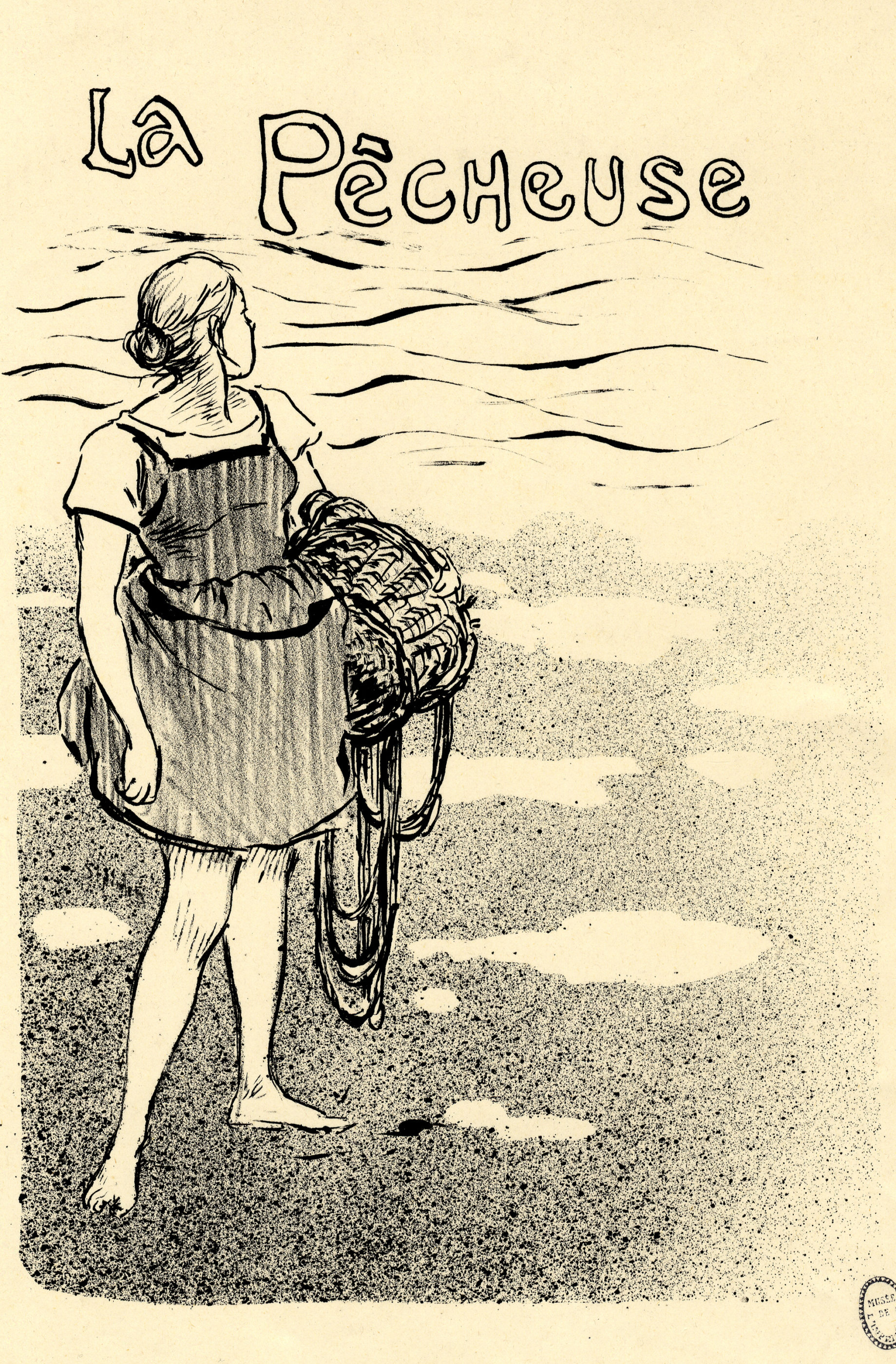 La technique du crachis consiste à passer une lame sur une petite brosse chargée d’encre. Le résultat est un méli-mélo de points, de grosseurs différentes, comme le sable de cette image. La robe de la pêcheuse a été dessinée au crayon, les contours principaux et les vagues au pinceau.