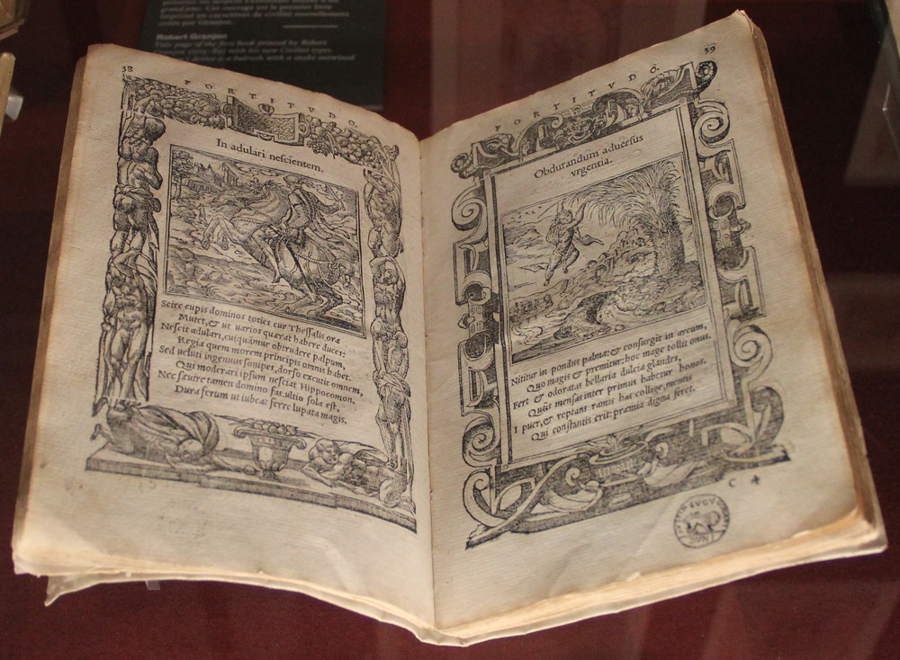 Les Emblèmes du jurisconsulte italien André Alciat, recueil d’images symboliques, connaissent au XVIe siècle un immense succès. Elles sont le point de départ d’un nouveau genre littéraire et d’une longue suite de productions imagées. Cette édition lyonnaise est ornée de 128 emblèmes dans des encadrements variés, le tout gravé sur bois. De nombreuses illustrations sont dues à Pierre Vase.