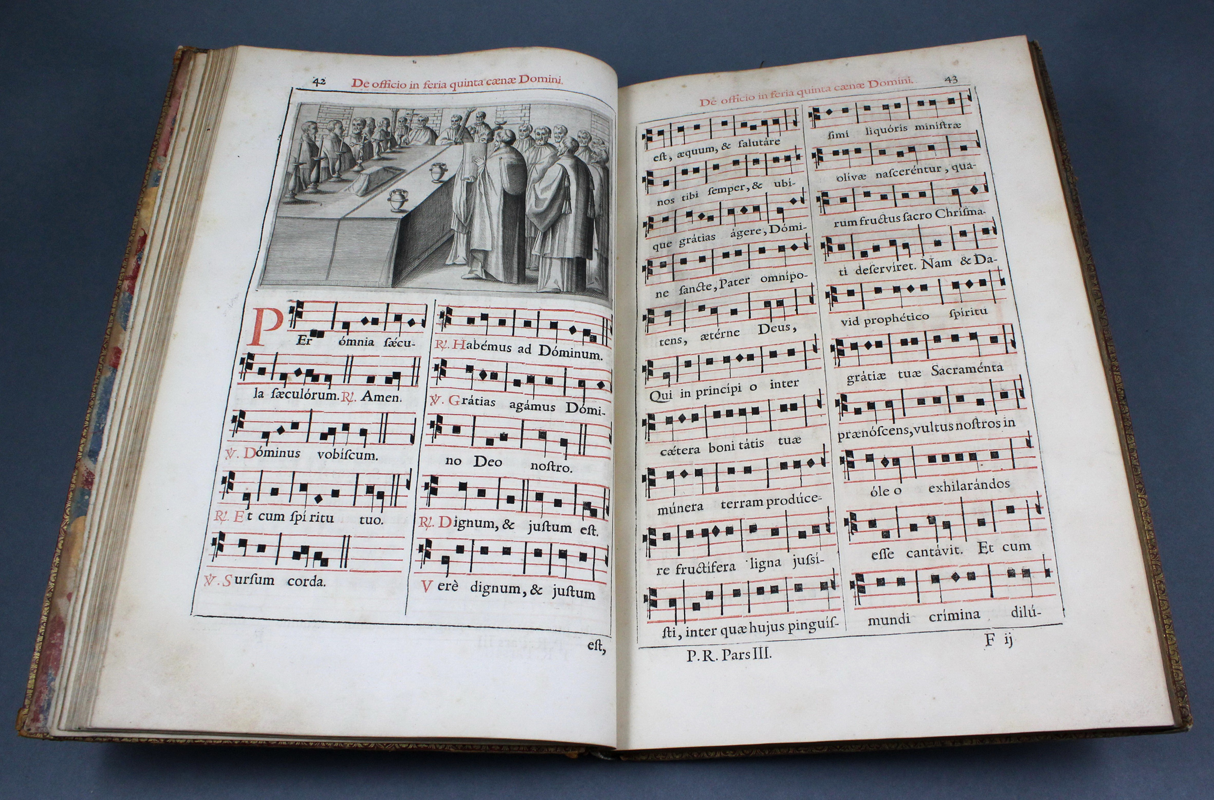 Troisième partie du Pontifical romain, qui décrit les cérémonies et les rites réservés aux évêques. La version « standard » de cet ouvrage remonte au pontificat de Clément VII (1523-1534). Il a connu de nombreuses variantes et éditions jusqu’au Concile de Vatican II (1962), date à laquelle il fut entièrement remanié. Cette mise en page complexe alliant textes, musique et images soigneusement agencés est représentative du style « baroque » de l’édition catholique du XVIIe siècle. L’impression en rouge et noir – qui demande du temps et une grande précision – accentue l’aspect luxueux de cette édition parisienne.