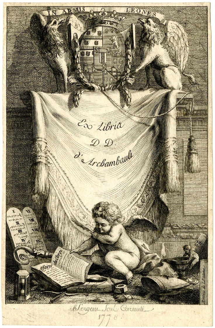 Cuivre gravé au burin pour l’impression des ex-libris du prêtre Charles-Claude d’Archambault (1713-1786), vicaire-général de Senlis, et chanoine de la Cathédrale de Chartres. L’ex-libris (de la bibliothèque de…) est collé à l’intérieur du livre pour indiquer sa provenance.