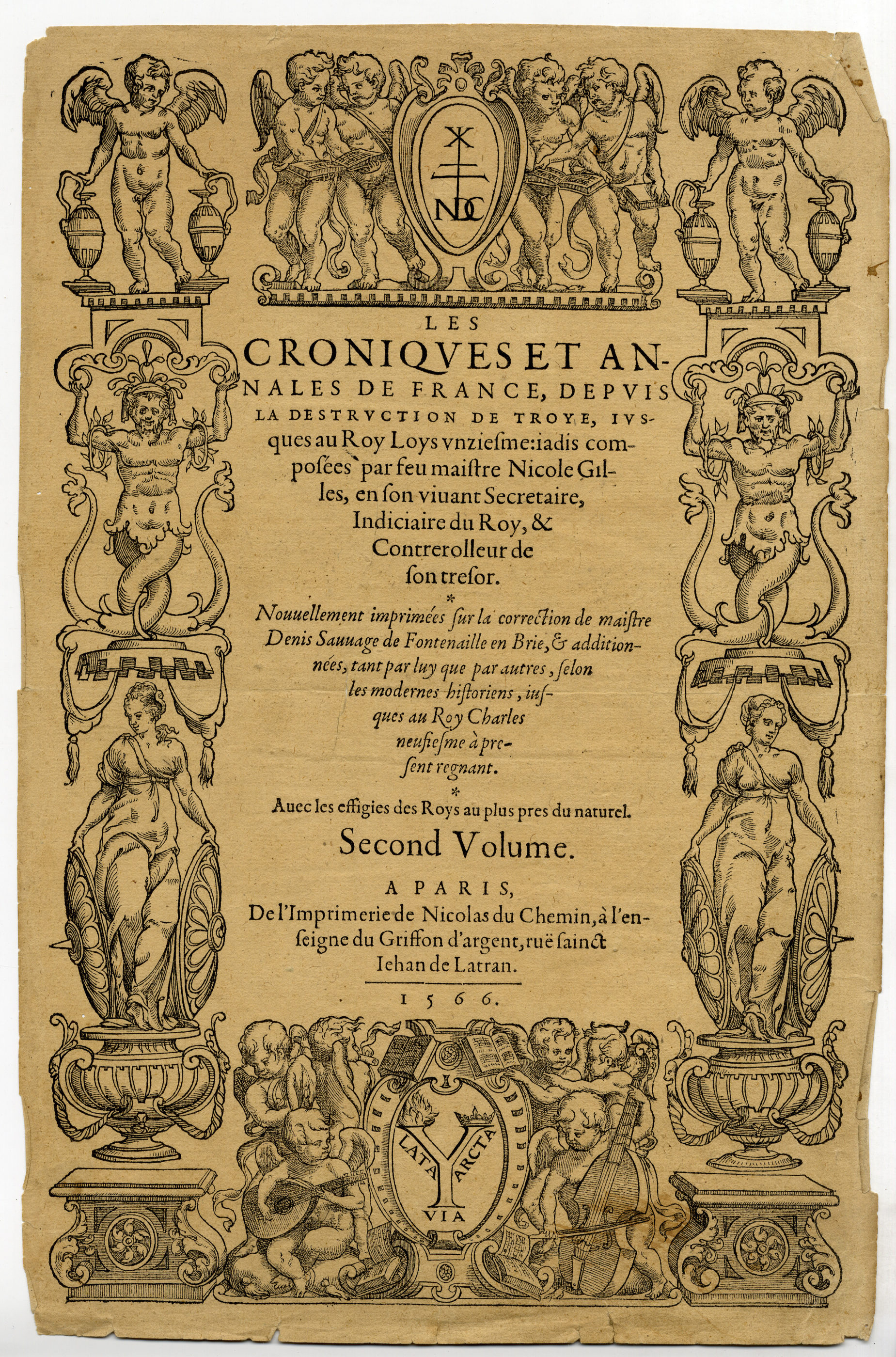 L’identité et l’adresse de l’imprimerie sont clairement indiquées sur cette page de titre richement ornée : De l’Imprimerie de Nicolas du Chemin, à l’enseigne du Griffon d’argent, rue Saint-Jean de Latran. La marque de l’imprimeur présente un « Y », symbolisant deux chemins, l’un allant vers la vertu (représentée par une couronne), l’autre vers le vice (les flammes). L’inscription latine Via Lata, Via Arcta signifie « chemin étroit, chemin large ».