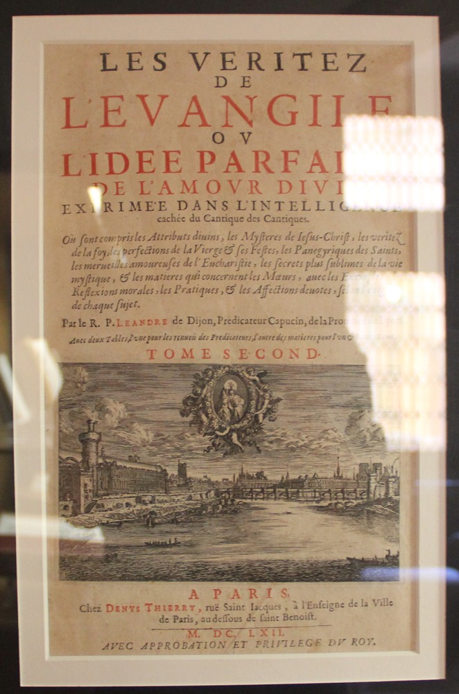 La page de titre imprimée en deux couleurs est ornée d’une belle gravure représentant la ville de Paris, enseigne de l’imprimeur-libraire Denis Thierry, ainsi qu’une effigie du saint patron de Paris, saint Denis, qui selon la légende, fut décapité.