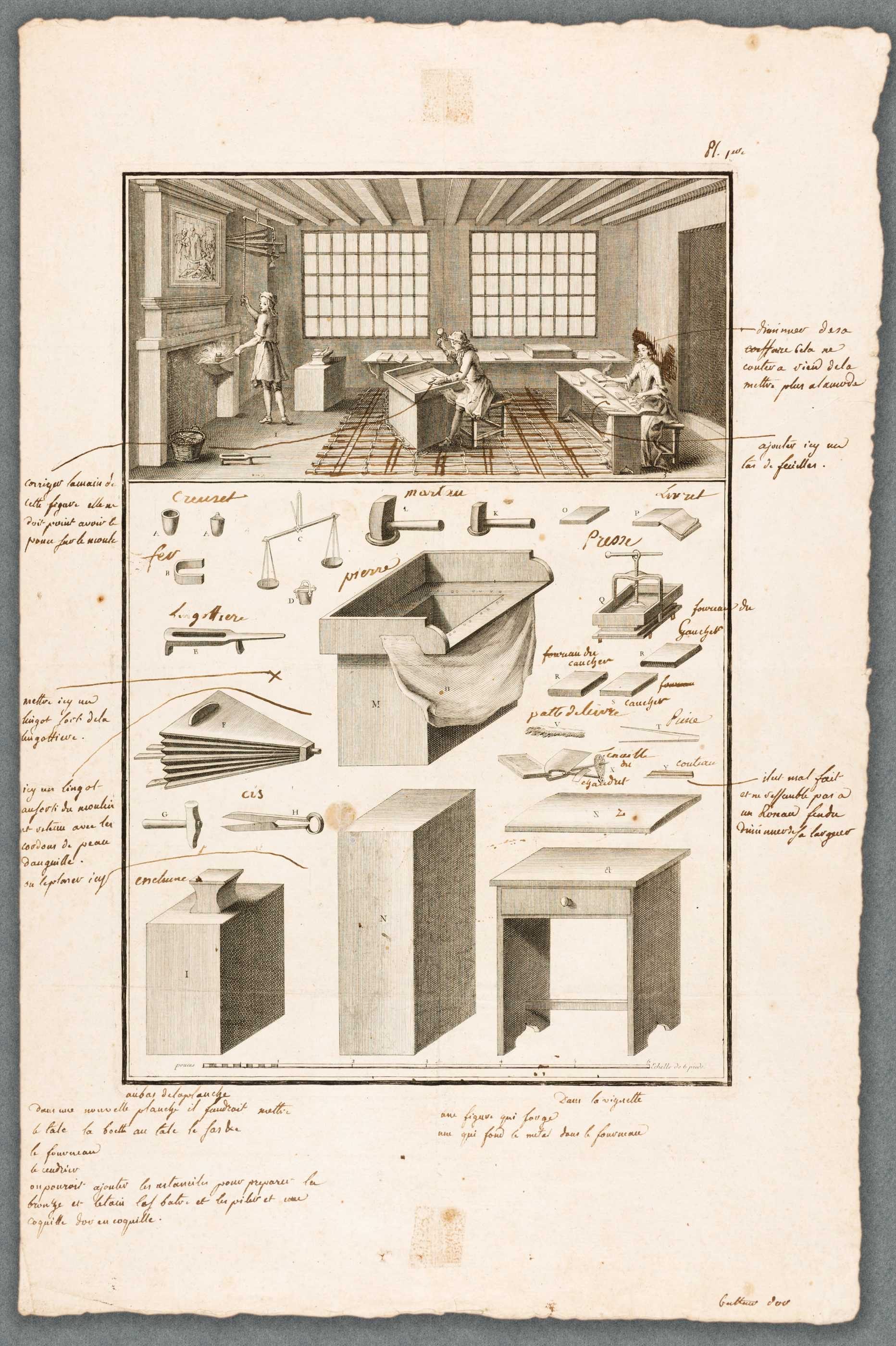 Cuivre gravé au burin pour illustrer l’article sur l’art du batteur d’or destiné à faire partie de la Description des arts et métiers, un traité technique consacré à l’ensemble des arts mécaniques, préparé sous l’égide de l’Académie royale des Sciences. L’épreuve de la planche porte les indications de toutes les corrections qui doivent y être apportées, notamment la position des mains des différents personnages. Cette planche est restée inédite.