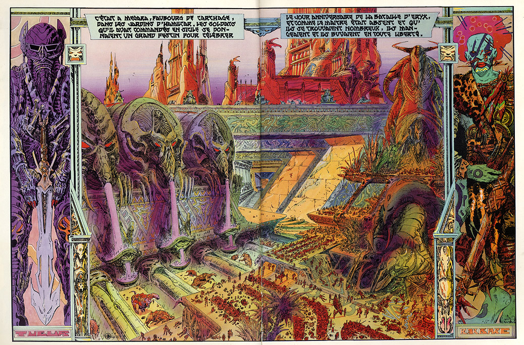 La bande dessinée est un genre à part entière dans la production livresque. Elle acquiert au cours du XXe siècle une importance croissante, passant progressivement du statut de gentil amusement pour enfants à celui de « roman graphique » aux consonances autrement artistiques. Philippe Druillet, dans sa célèbre et mystérieuse adaptation du Salammbô de Flaubert, montre sa virtuosité par de grandes images, proches de la peinture, qui visent surtout à créer un univers. Chaque planche demande de nombreuses heures de travail. Les textes, dessinés dans un style en lien avec l’image, sont peu nombreux : c’est ici l’image qui mène le récit.