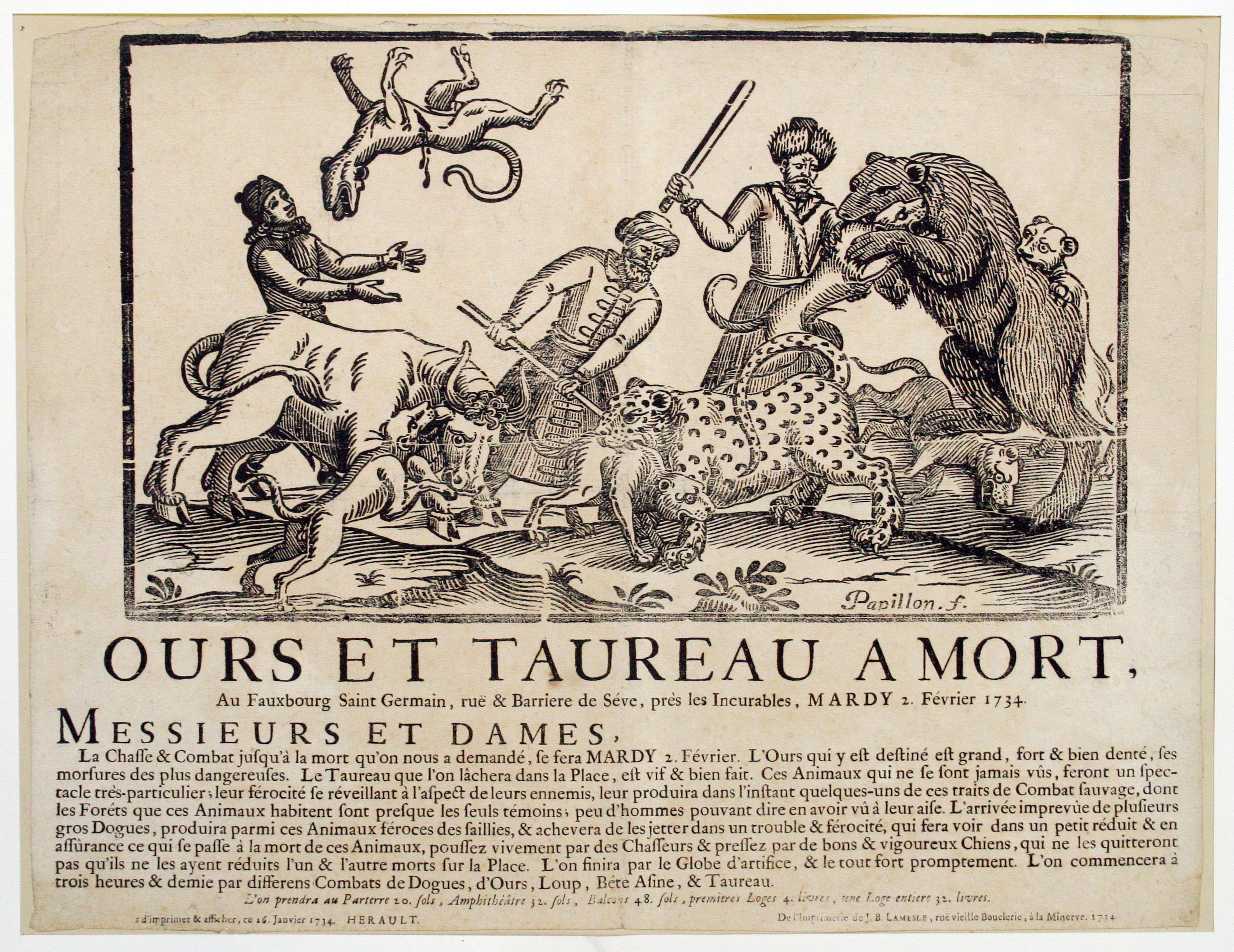 Selon le graveur de cette sanglante illustration, Jean-Michel Papillon, la planche a effectué plus d’un million d’impressions entre 1734 et 1761. Comme c’est souvent le cas avec les documents les plus courants mais les moins considérés, seulement une poignée d’exemplaires de cette affiche ont survécu. La planche n’a subi d’autre détérioration qu’une fente longitudinale visible sur le tirage.
