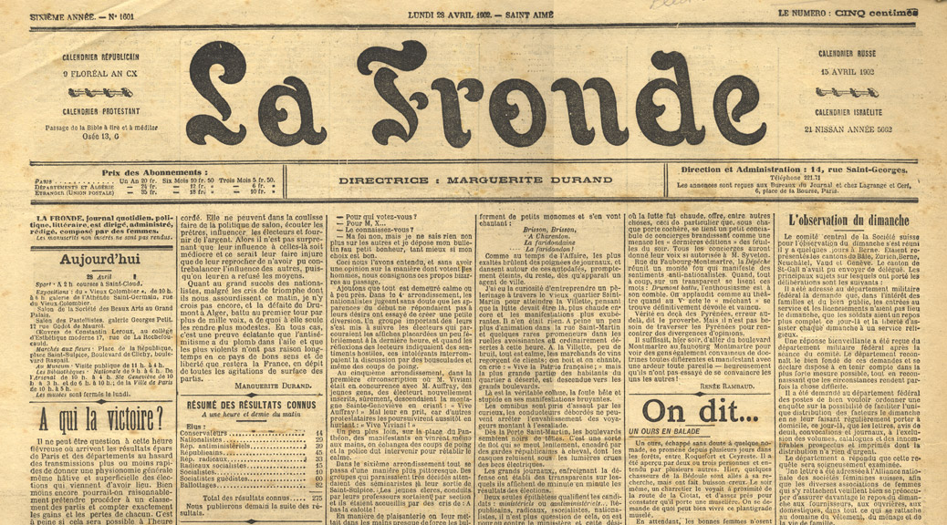 Avec l’alphabétisation de plus en plus large de la population à la fin du XIXe siècle, les femmes, à qui l’on n’apprenait guère à lire pendant des siècles, deviennent un lectorat à part. Dès le milieu du XIXe siècle, des publications leur sont dédiées, traitant principalement de mode, décoration, soin à la famille. La Fronde, quotidien féministe fondé en 1897 par Marguerite Durand, était surnommé « Le Temps en jupon ». Il se voulait « comme les autres,… pas plus amusant ». Destiné aux femmes, il était également, de la rédaction à l’impression, entièrement réalisé par des femmes.